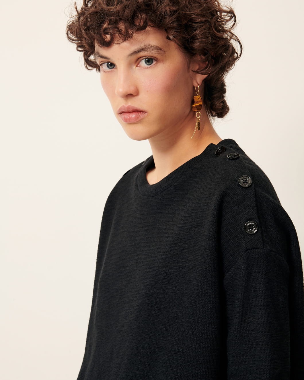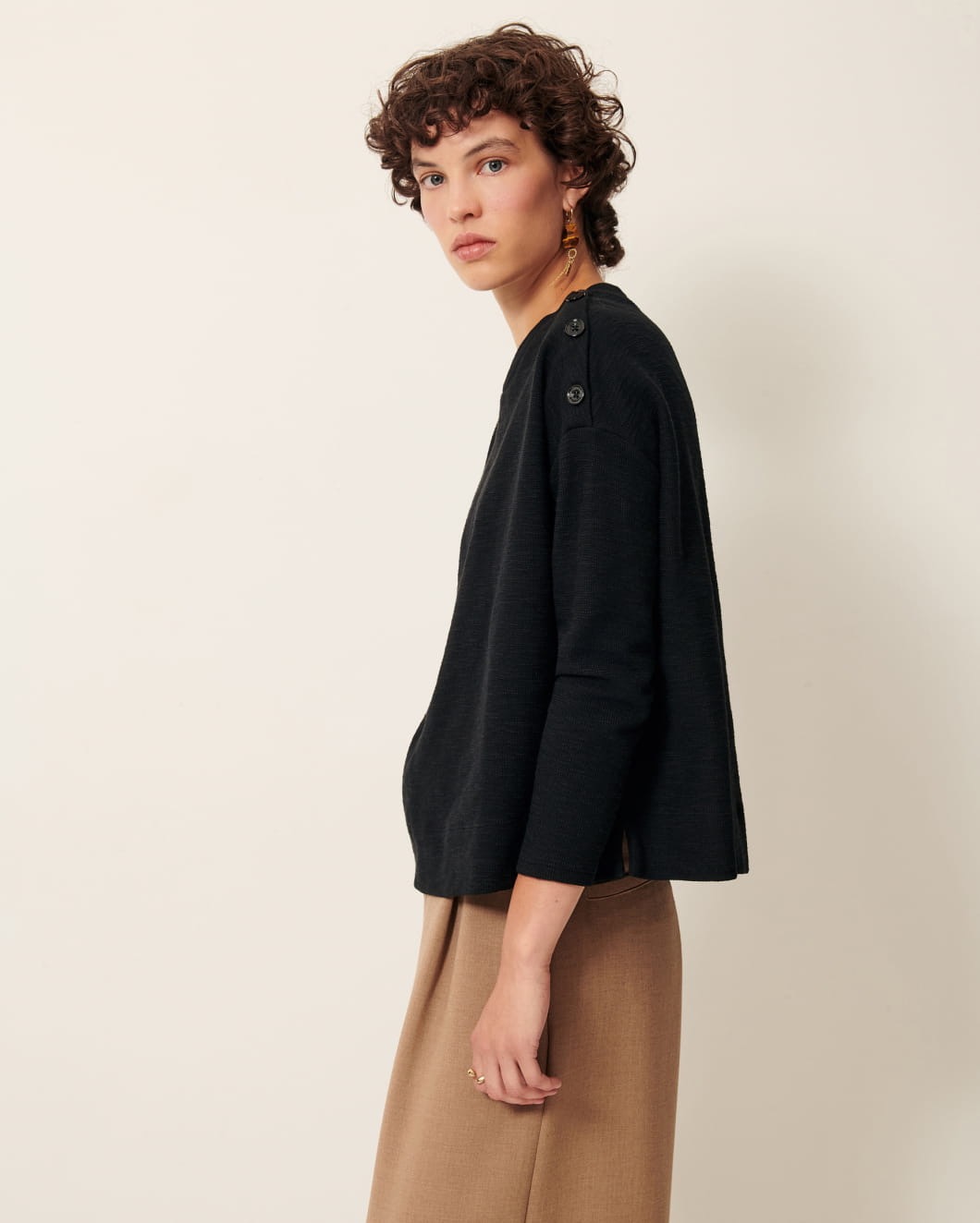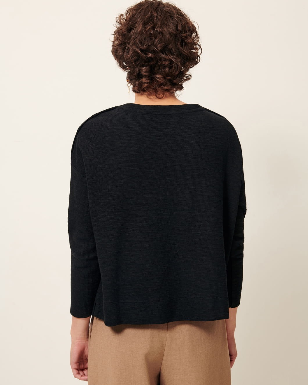 Langærmet t-shirt i et groftvævet bomuldsmateriale med firkantet struktur. Rund hals, dropskuldre og knaplukning på begge skuldre.