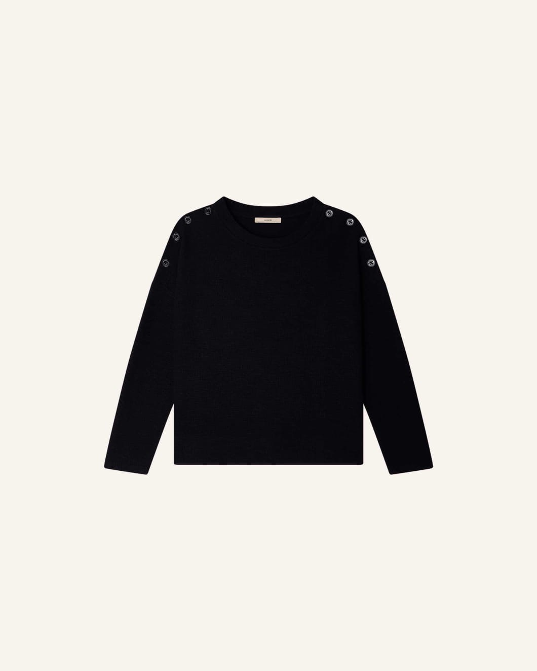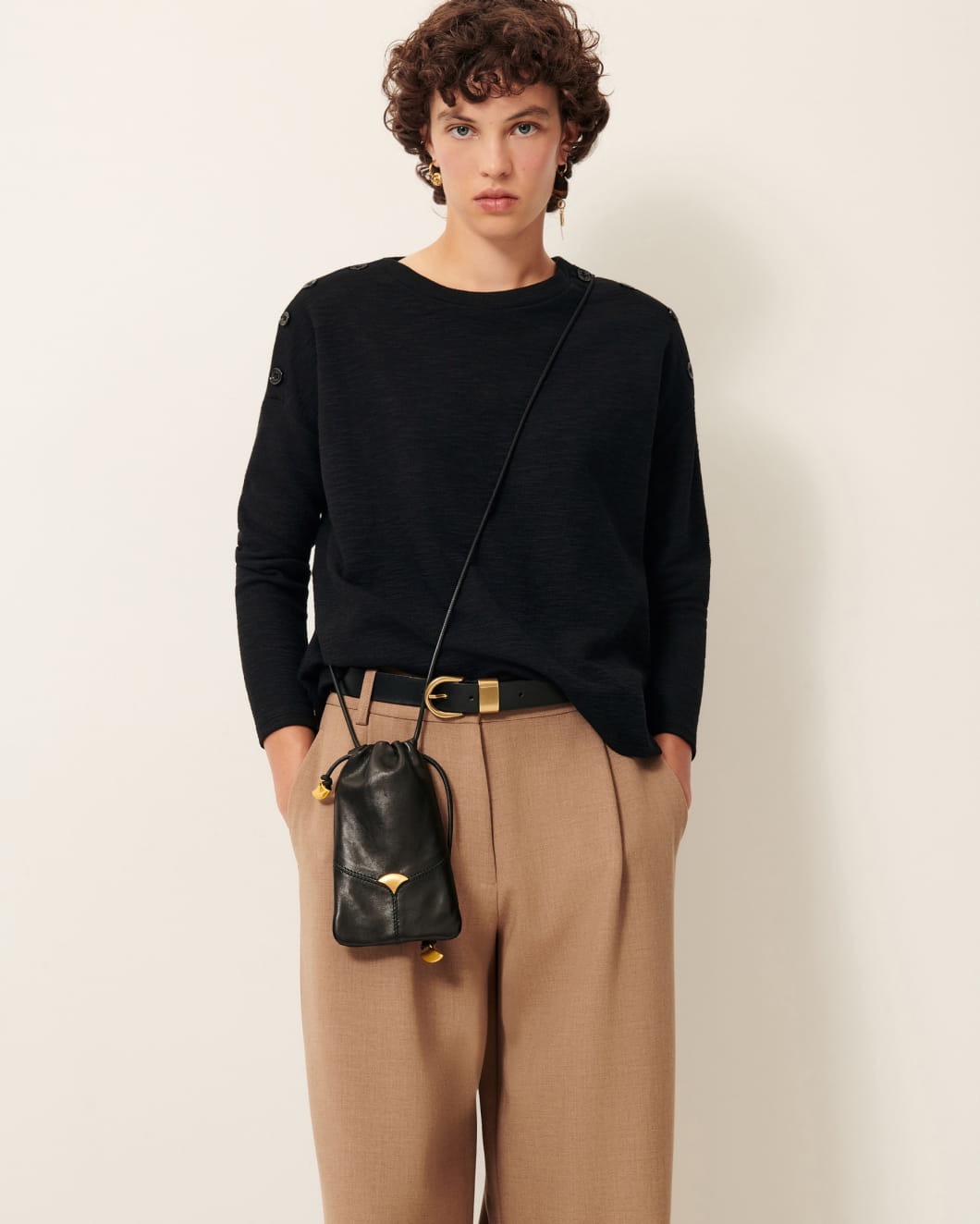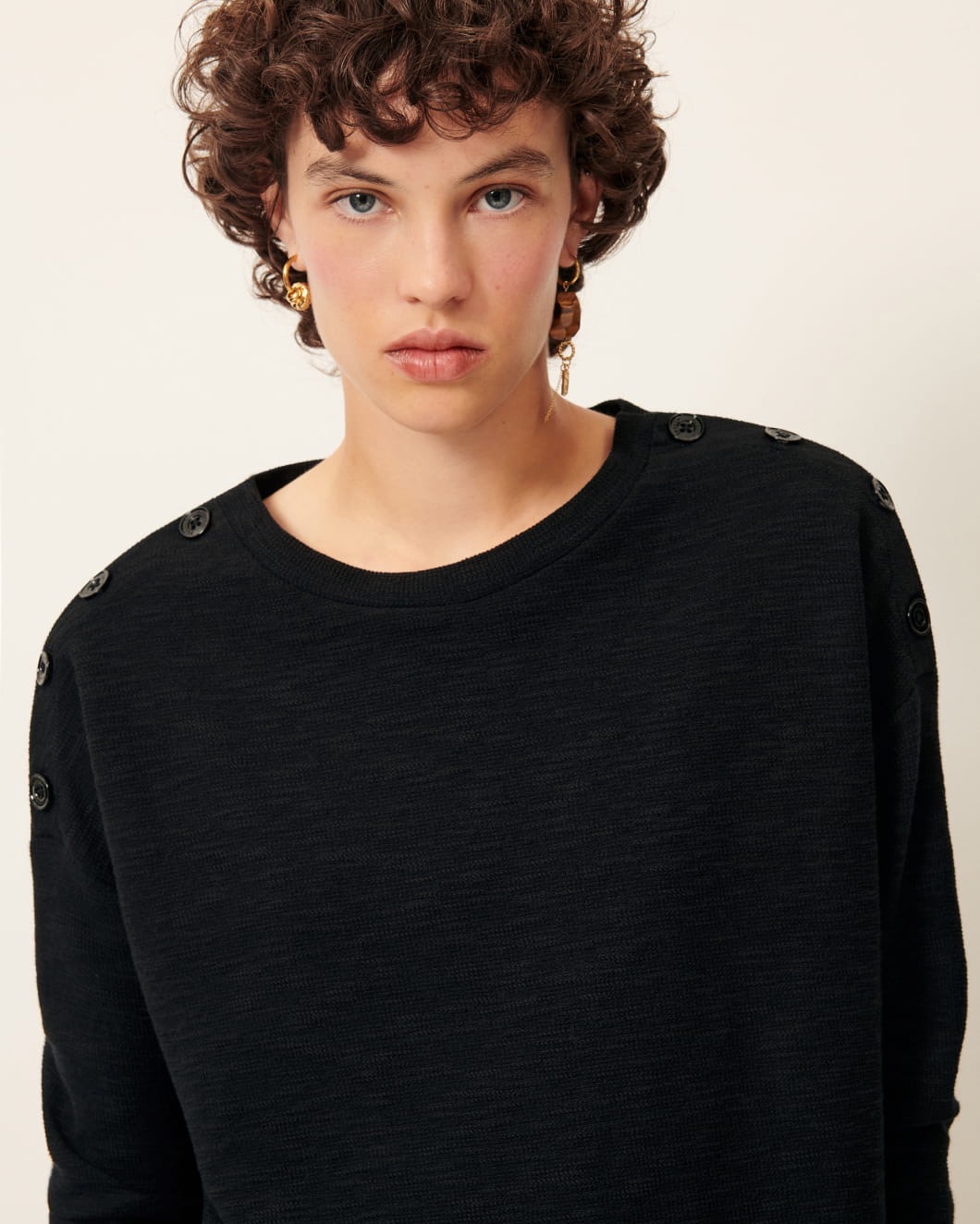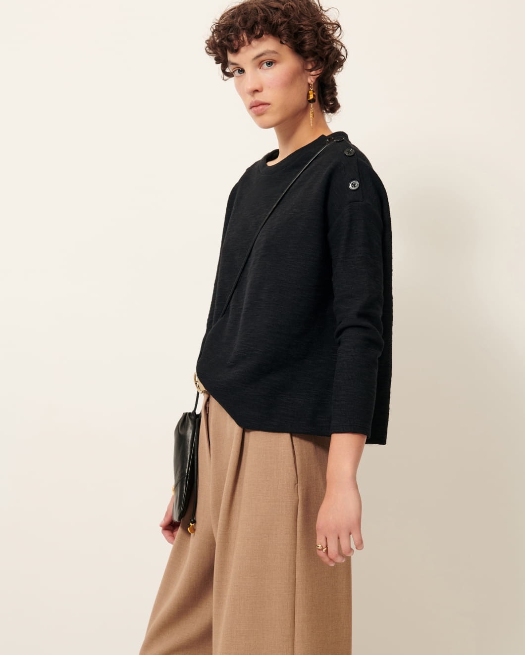 Langærmet t-shirt i et groftvævet bomuldsmateriale med firkantet struktur. Rund hals, dropskuldre og knaplukning på begge skuldre.