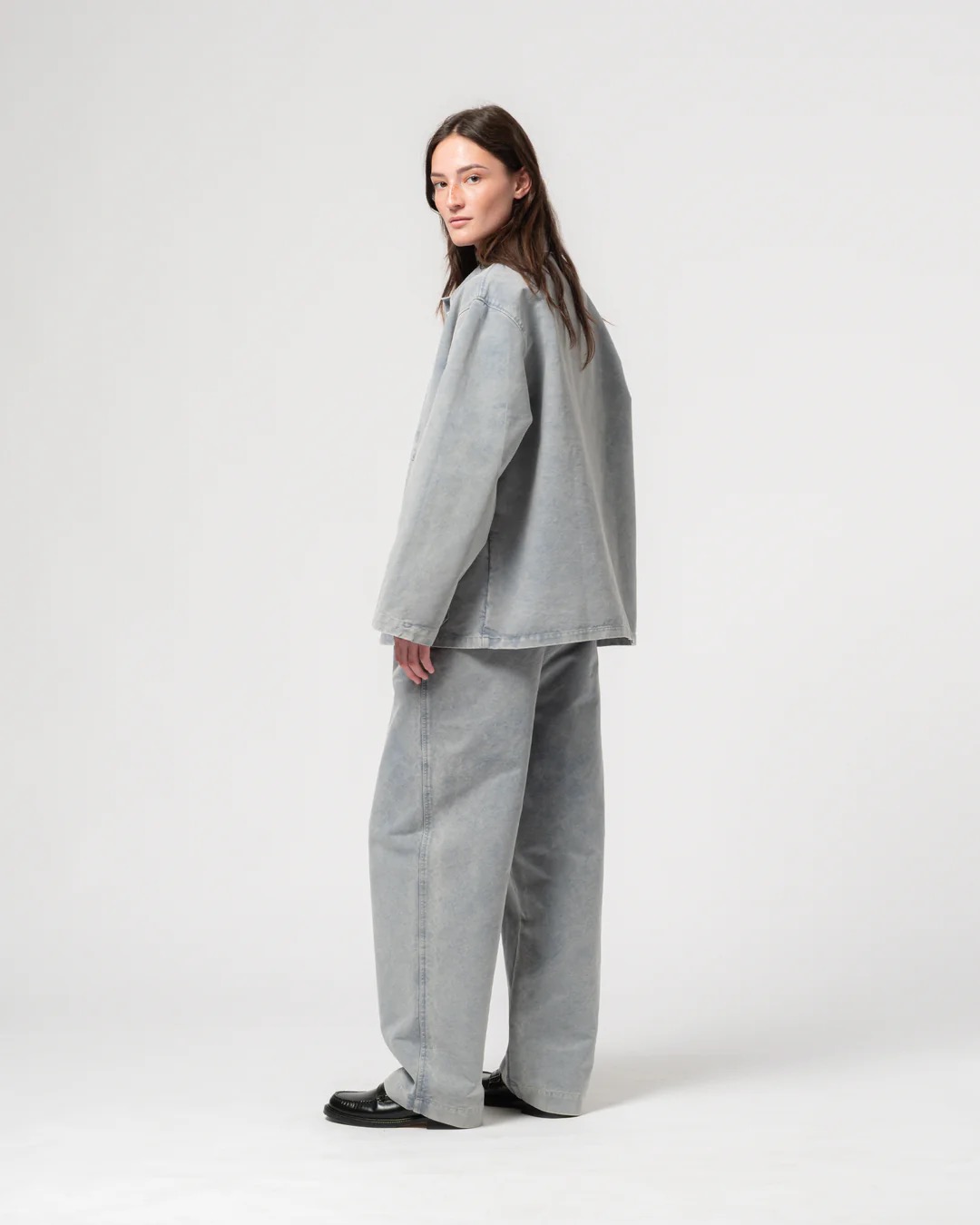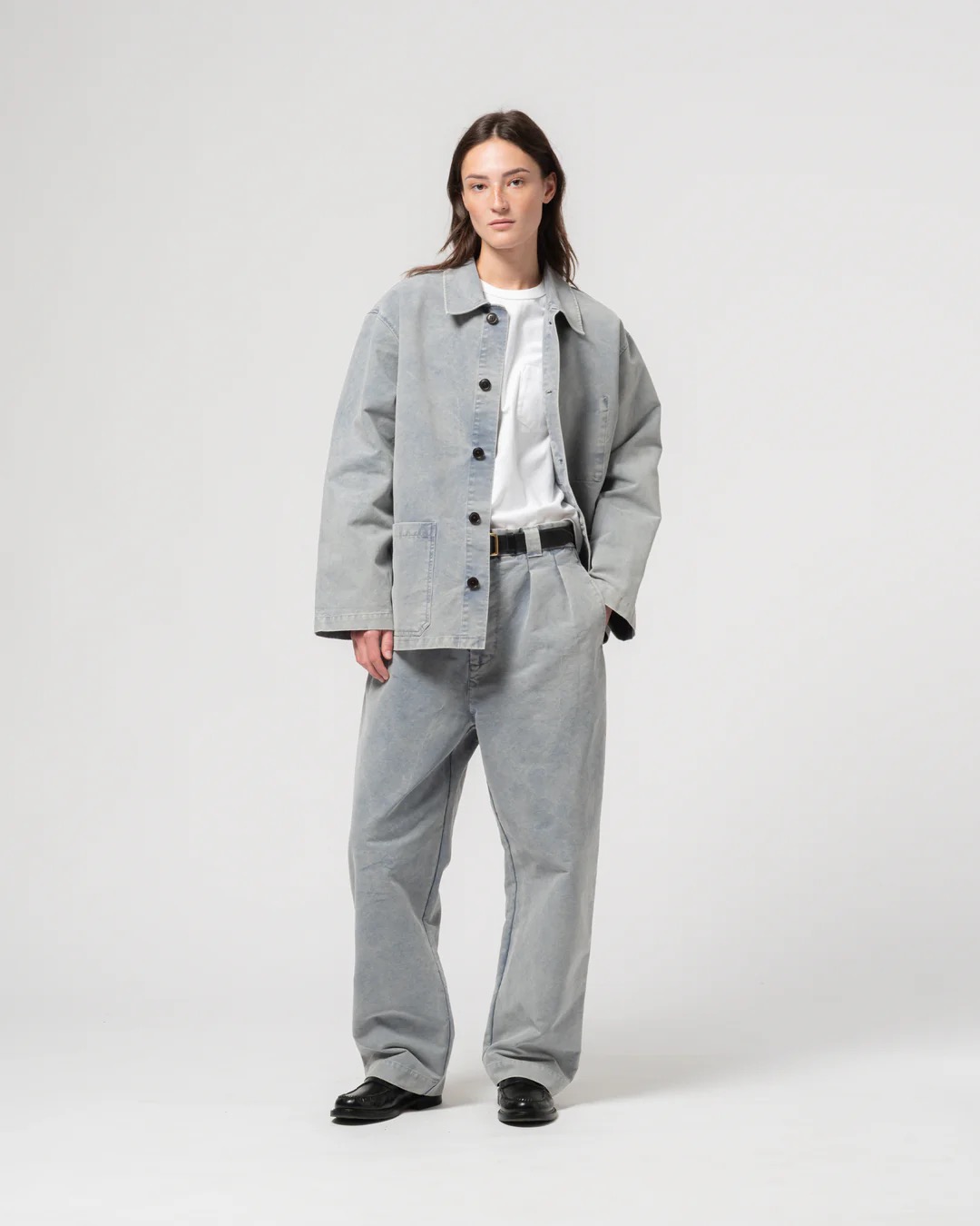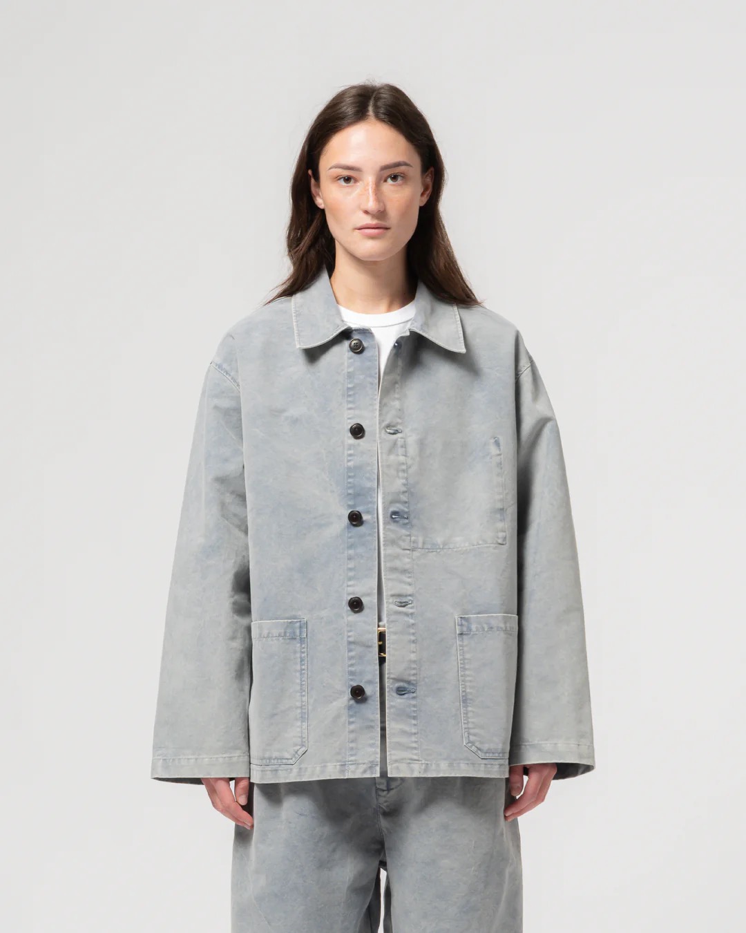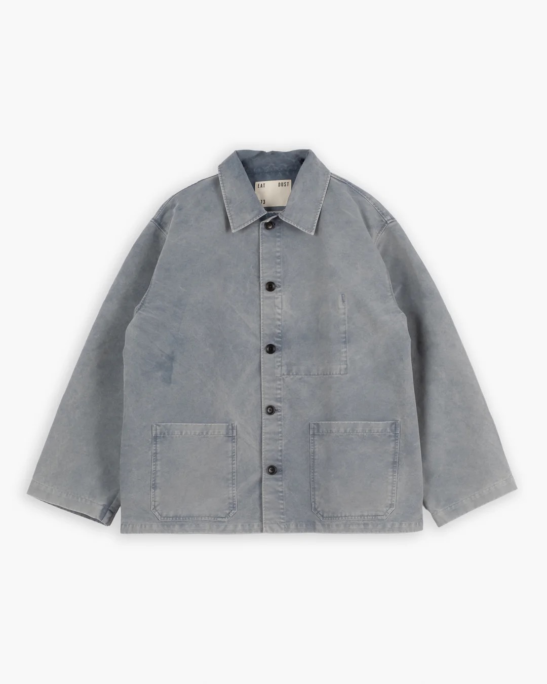 Jakke i kraftig vasket bomuld med afslappet pasform og let dropped skuldre. Modellen har krave, corozo-knaplukning, to store frontlommer og en indvendig lomme. En enkel worker-jakke med god rummelighed, lavet til at holde i mange år.