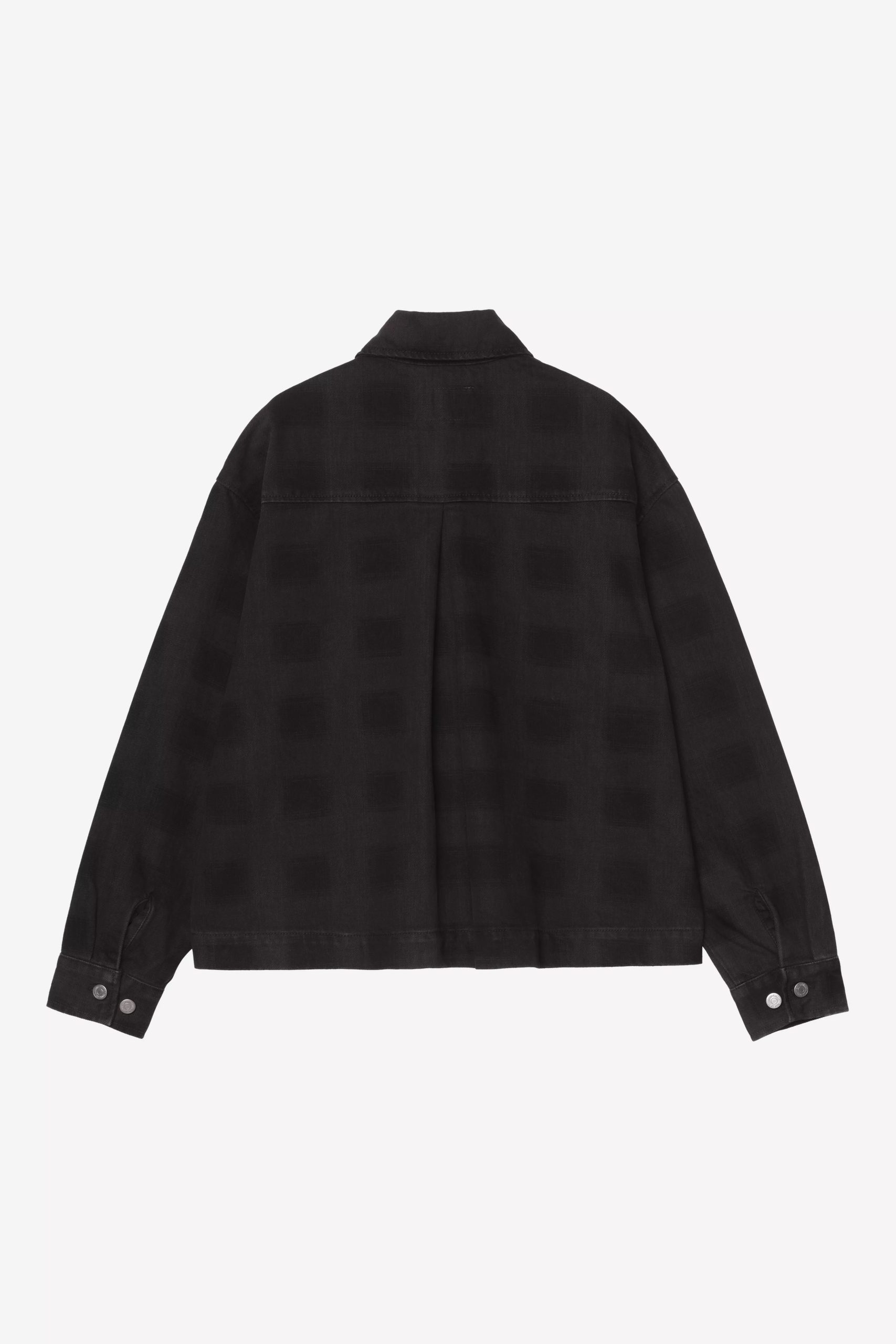 Jakke i ternet bomuldsdenim med en vasket finish, som giver et mere mat udtryk uden at miste struktur. Modellen er uforet og falder afslappet. Dropskuldre, læg bagpå og to store påsatte lommer foran.