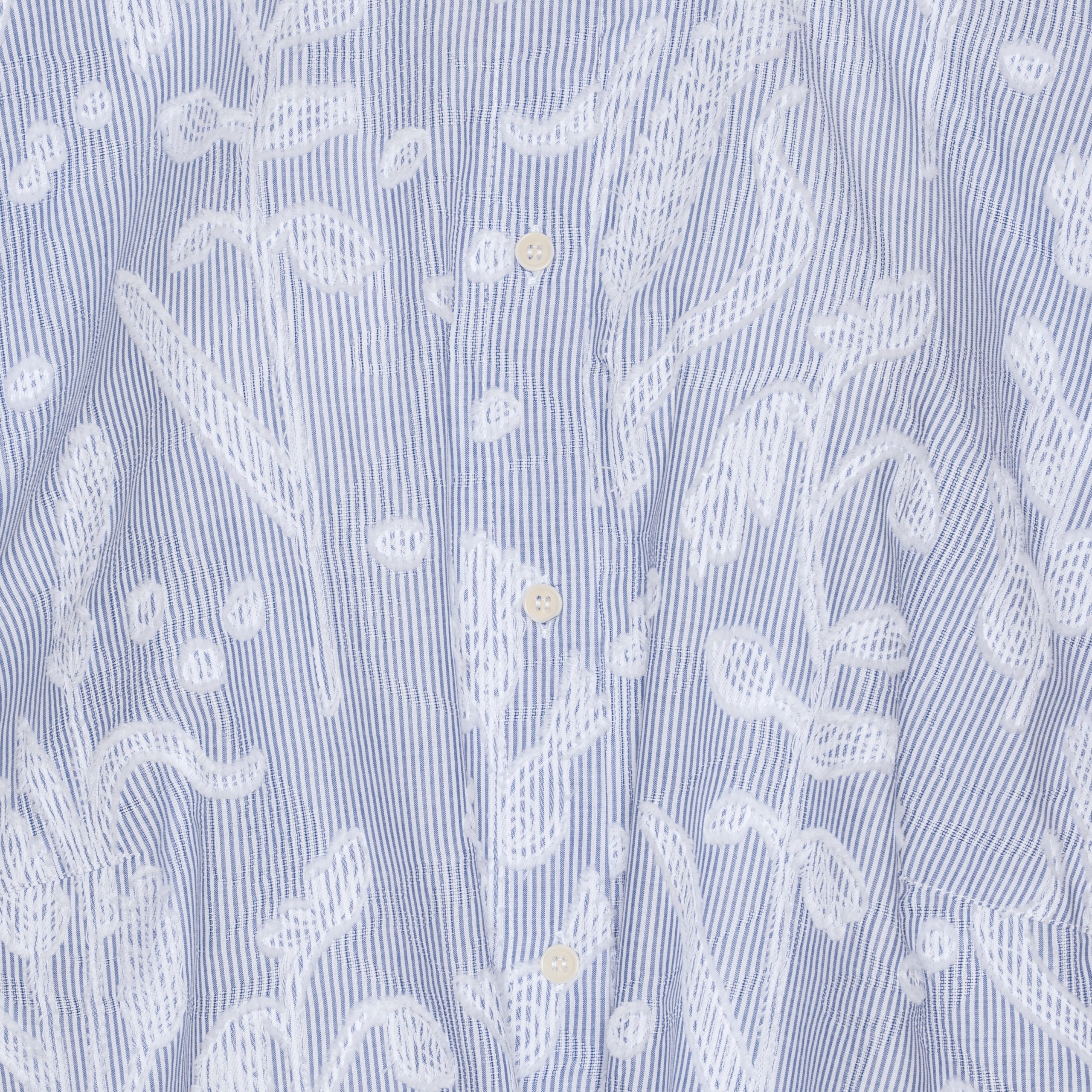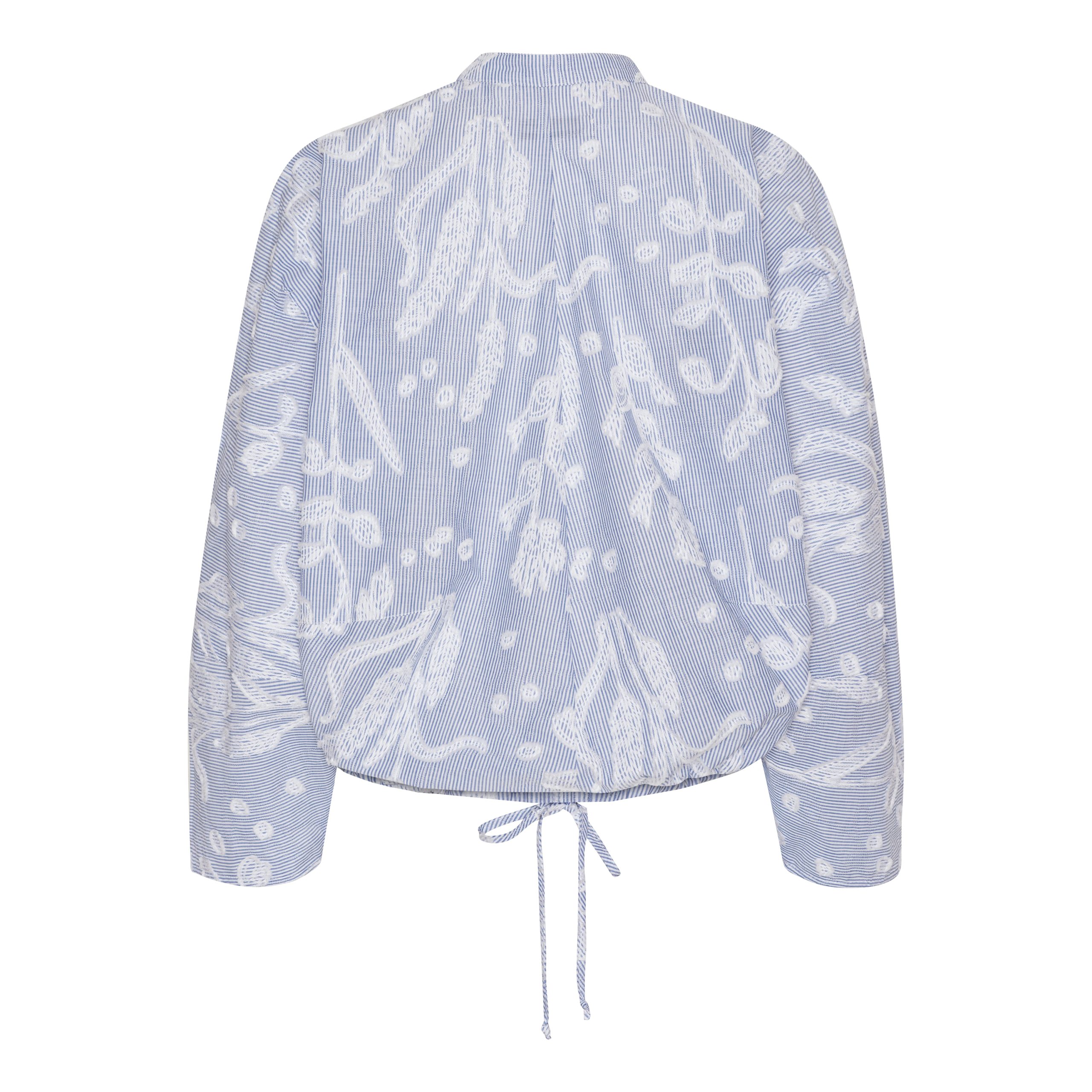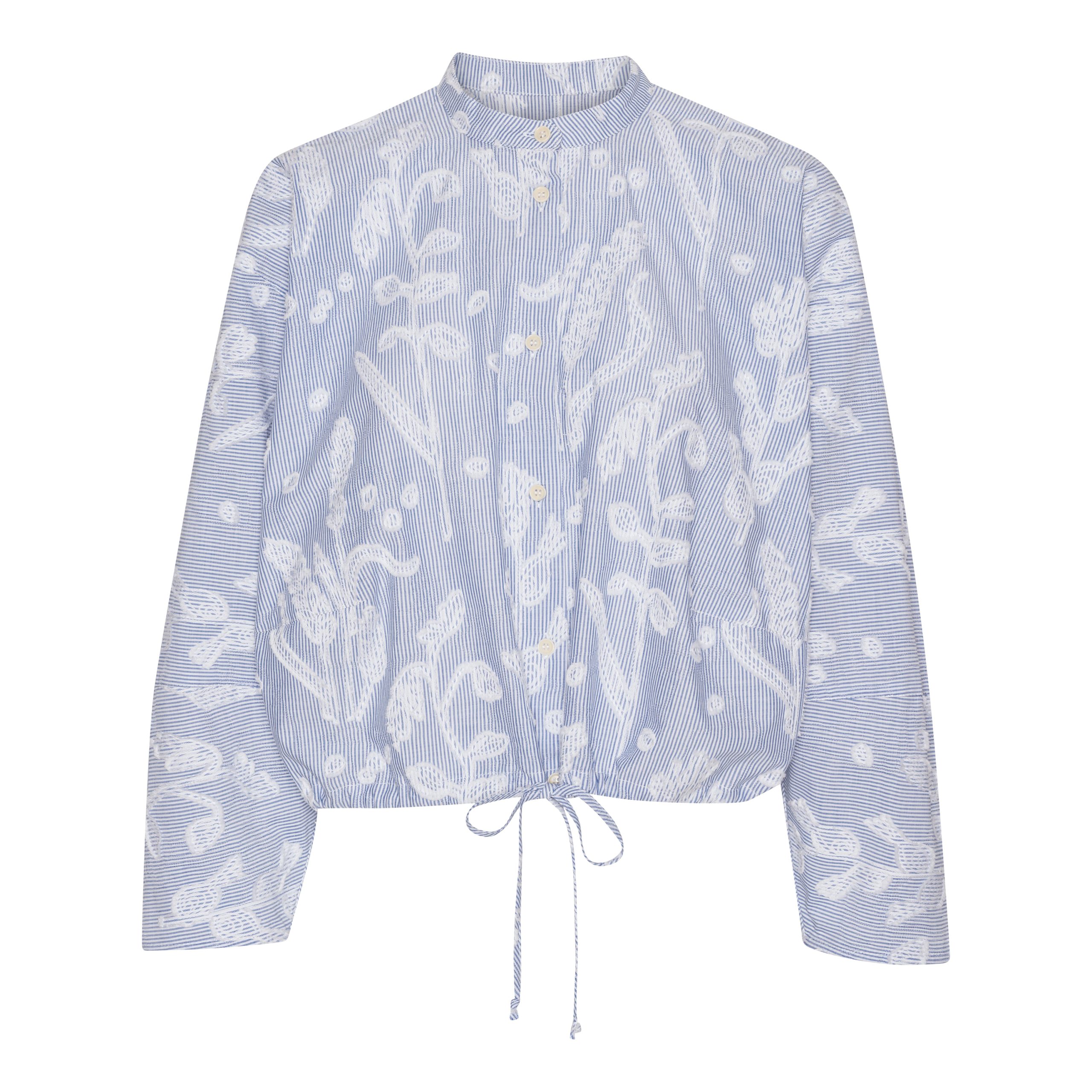 Ballonformet skjorte med diskrete striber og vævet floralt mønster, voluminøst formede ærmer og gennemknapning med løbegang og snøre nederst.