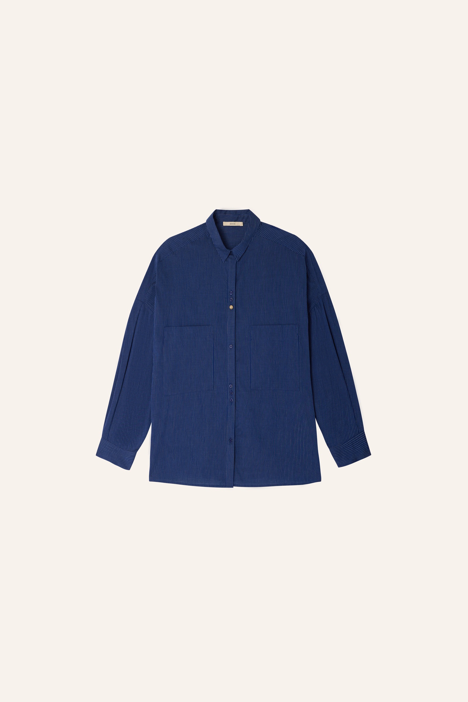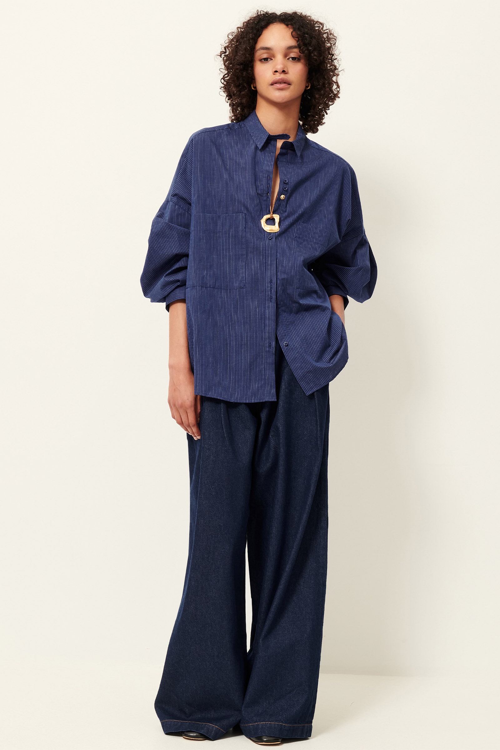 Løs skjorte i nålestribet poplin vævet i Italien. Modellen har en løs pasform med drop skuldre og læg, der giver ærmerne en god volumen. Gennemknapning med uregelmæssigt placerede knapper og en smykkeknap øverst. To store lavtsiddende brystlommer og bagpå en læg med lille stropdetalje. Stor i størrelsen, så gå evt en størrelse ned.