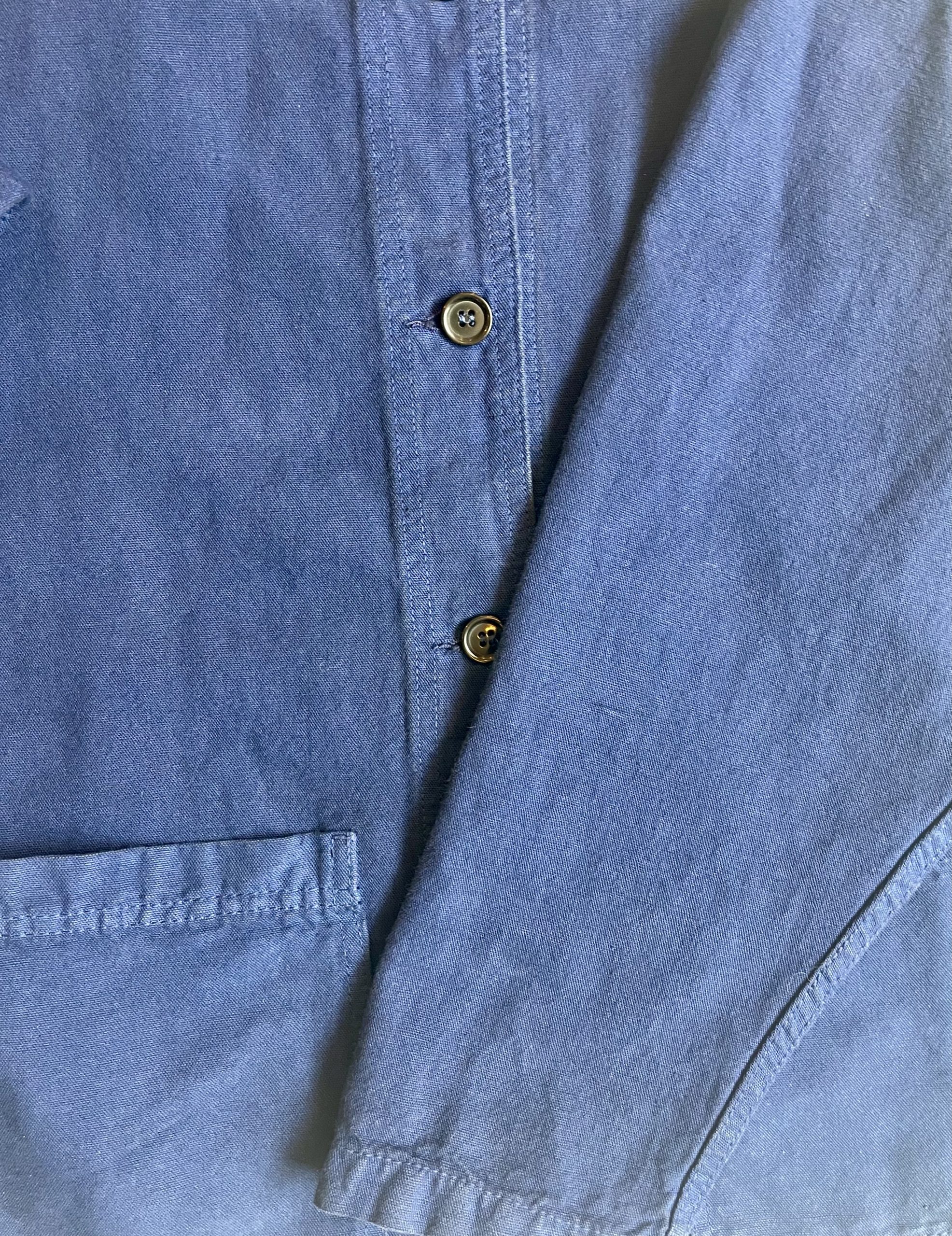 Den originale franske arbejdsjakke i tyndt tætvævet kanvas i arbejdsblå. Knaplukning, skjortekrave og 2 udvendige lommer. Denne model er løstsiddende og har dropskuldre.