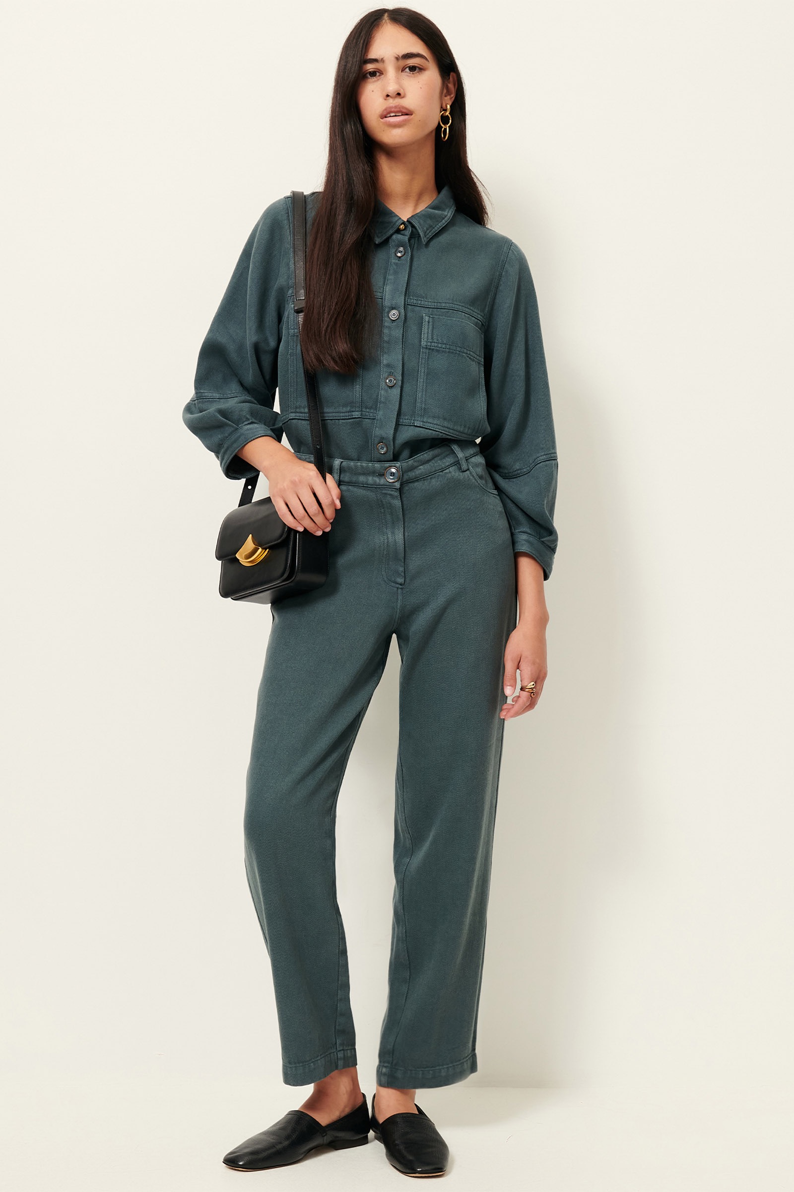 Et rent design med klassisk skjortekrave, to store brystlommer og tone-i-tone knaplukning foran. 3/4-lange ærmer med læg ved manchetten, som skaber en let ballonform og tilfører silhuetten volumen.