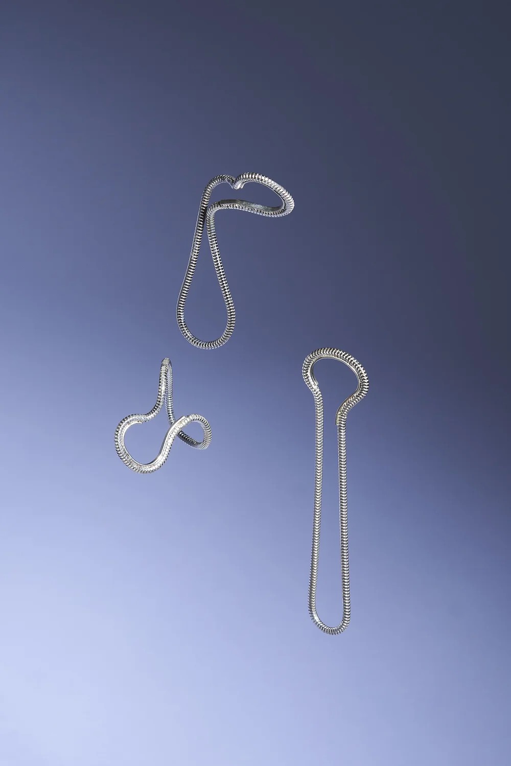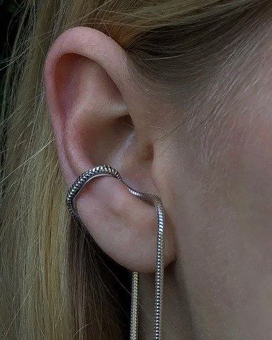 En blød og minimalistisk earcuff i sterling sølv, hvor en glat kæde former en elegant løkke omkring øret og falder let ned langs flippen. Det enkle design skaber et roligt, flydende udtryk.