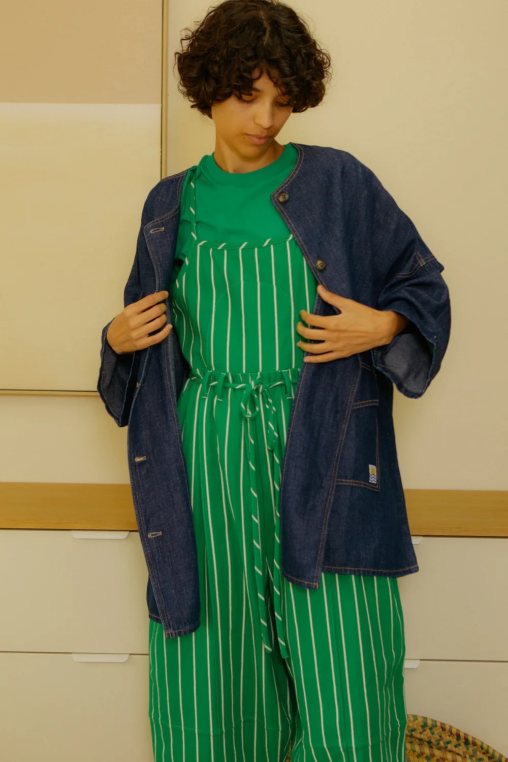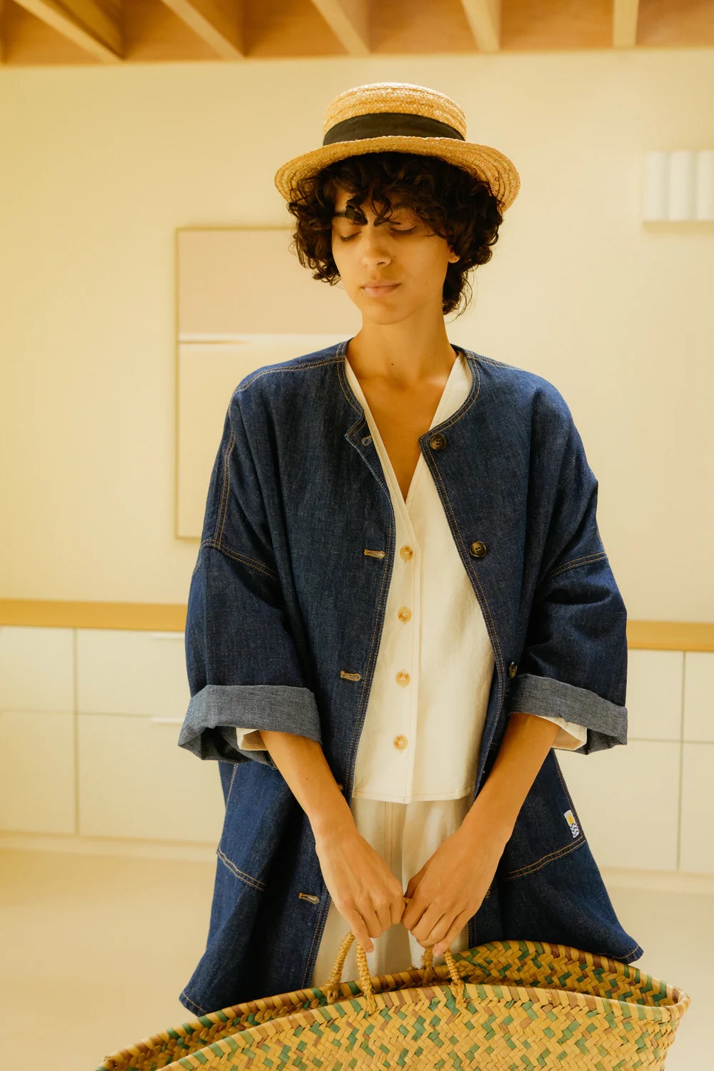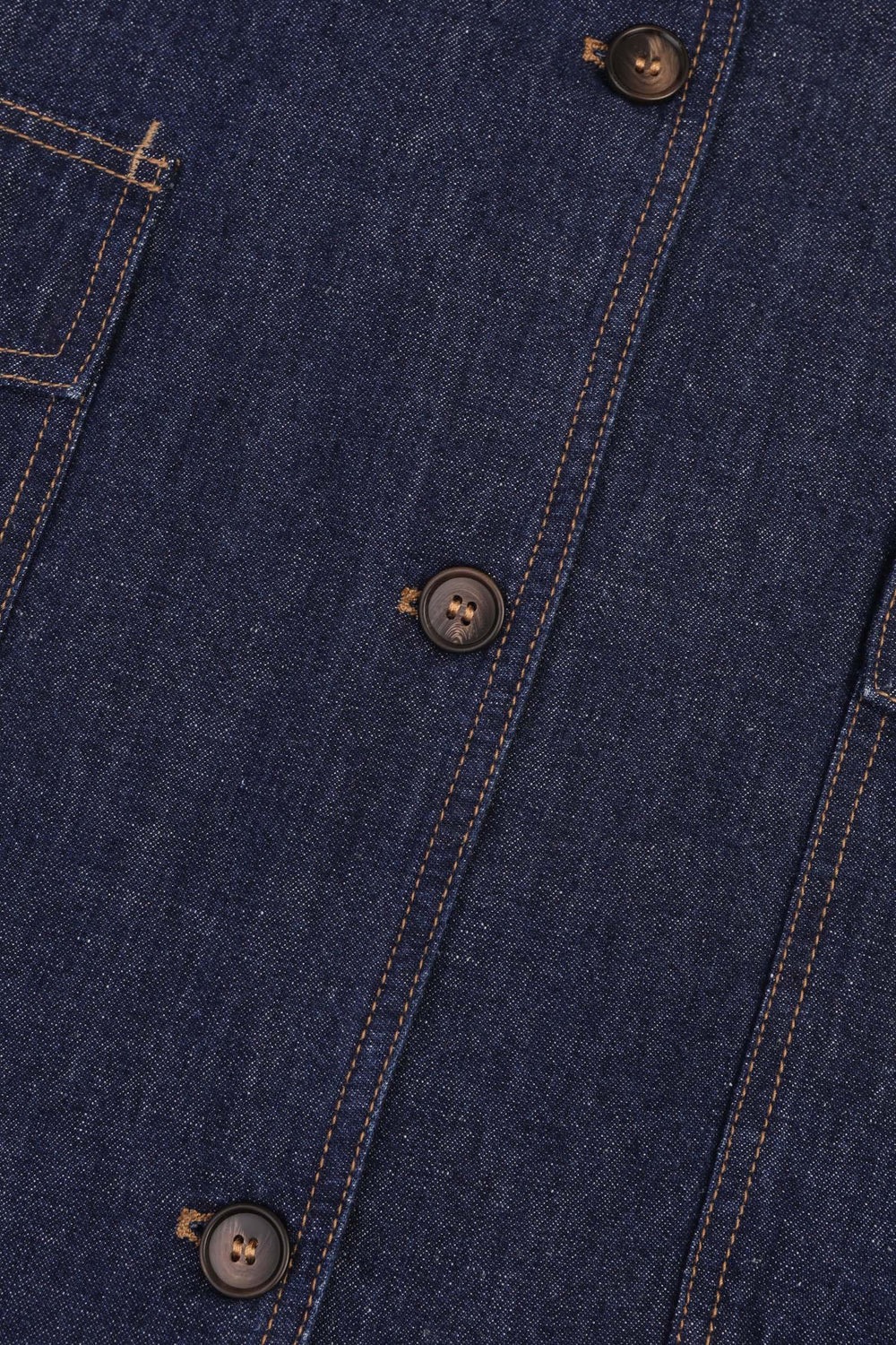 Skjorte-jakke i indigoblå denim chambray vævet i en blanding af bomuld og hør, som giver stoffet en let og tør struktur. Modellen har en bred, løs silhuet med rund halsudskæring, gennemgående knaplukning og dropskuldre med 3/4-lange og brede ærmer. Store lommer med flap nederst foran, kontraststikninger i okker og knapper i hornlook tilfører et tydeligt workwear-præg. Jakken er onesize.