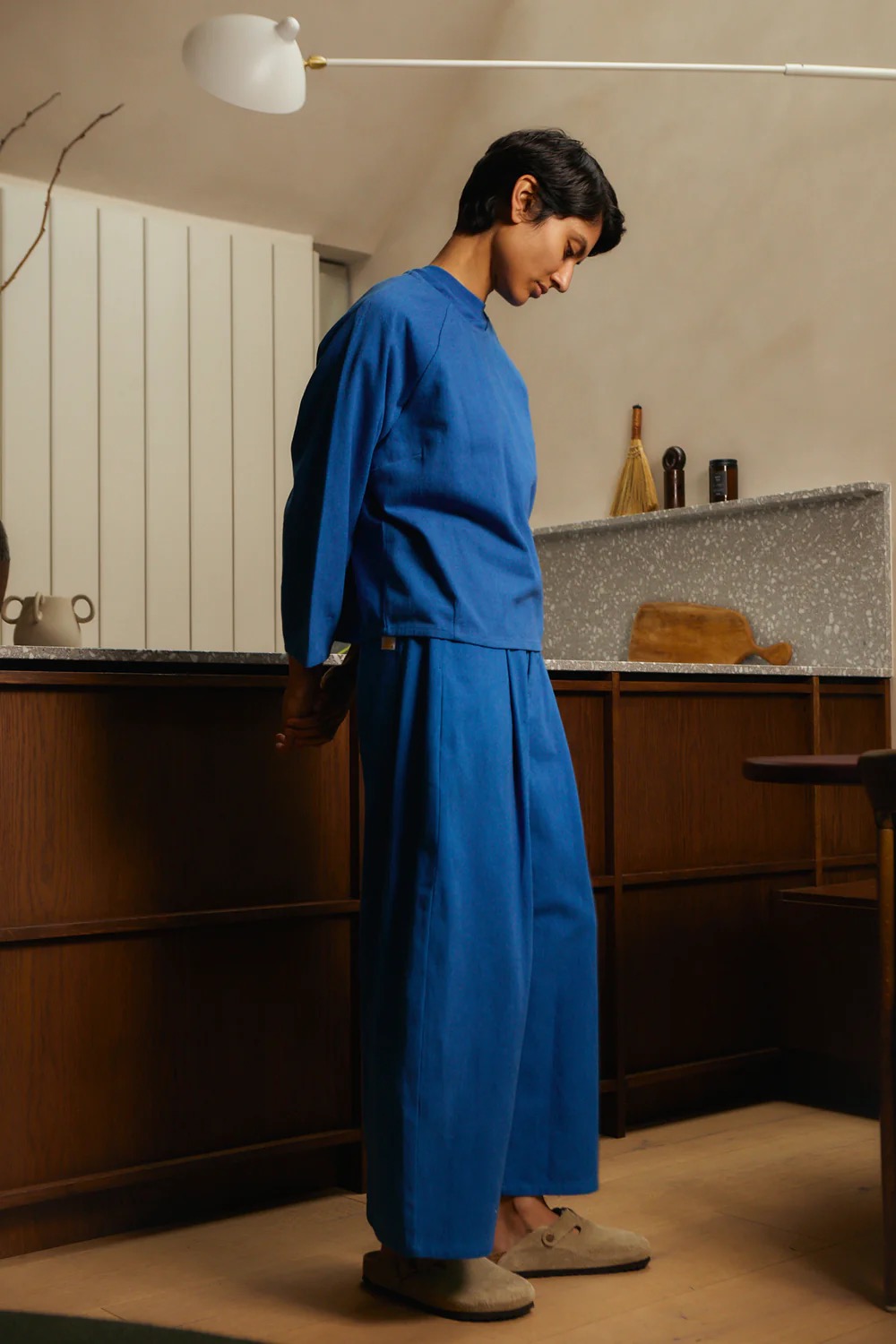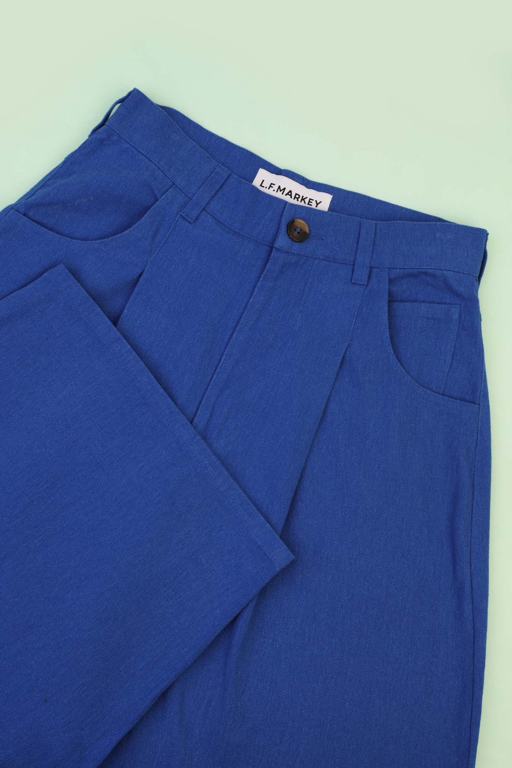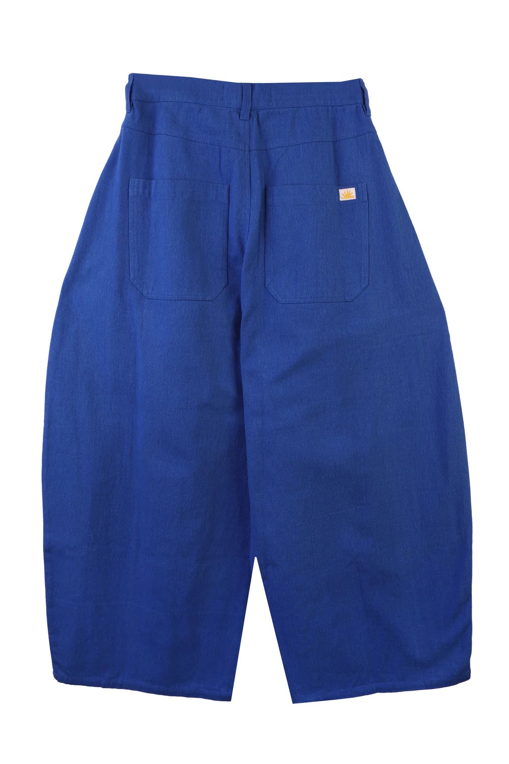 Ballon-formede bukser i koboltblå bomuld. Høj talje med læg og oversized bukseben til anklen. Trods det brede udtryk sidder bukserne flot til foroven med et super flot snit bagpå, hvilket gør dem til en af vores favoritter. Bukserne er størrelsessvarende, men til den lille side i taljen.