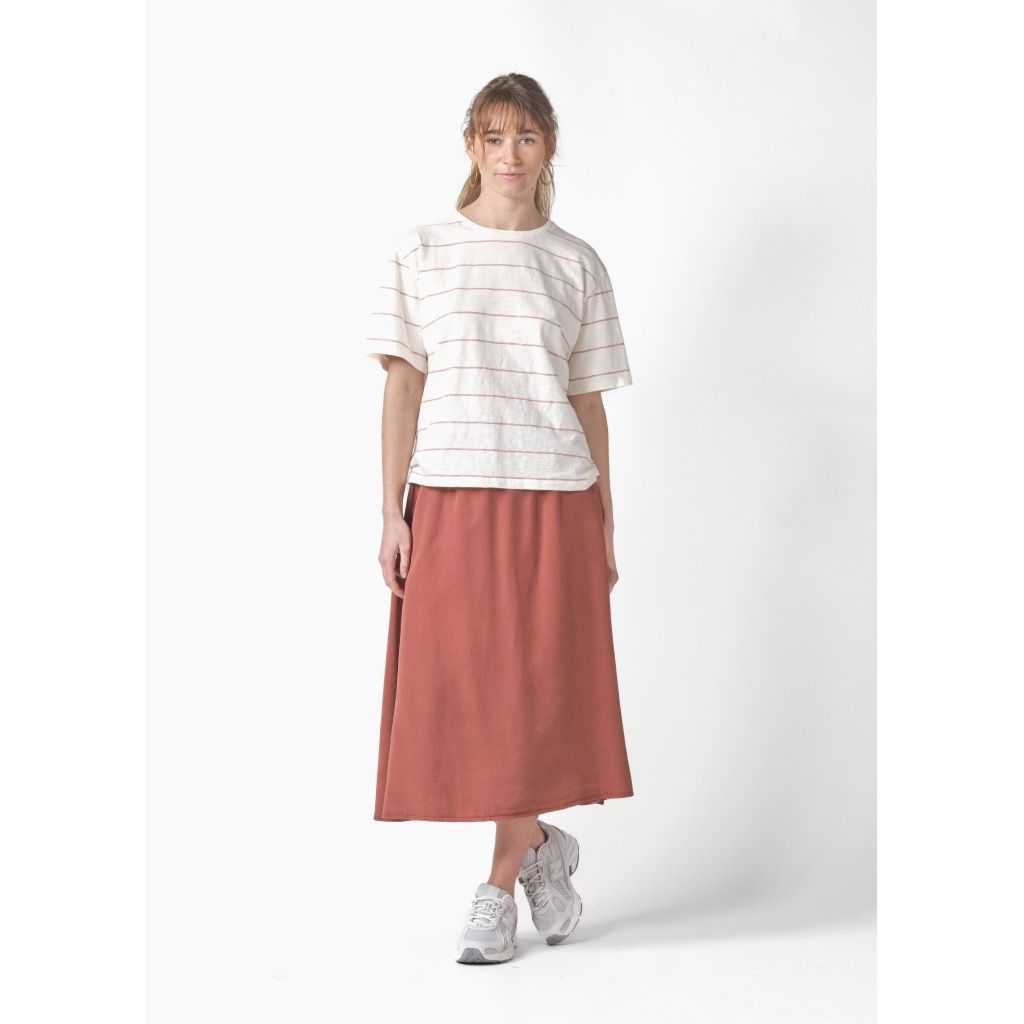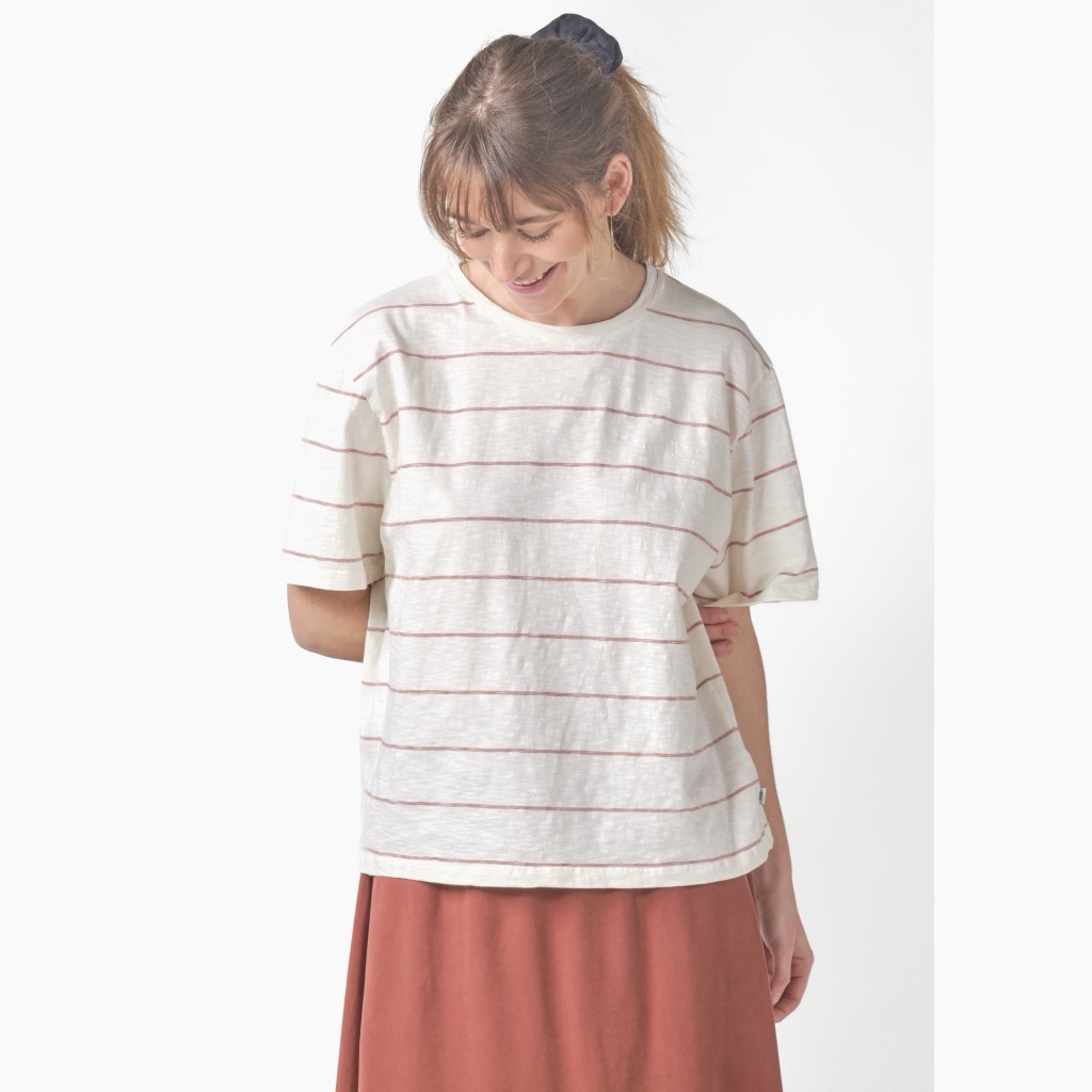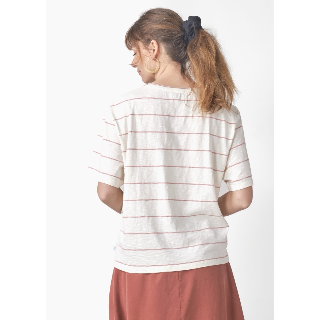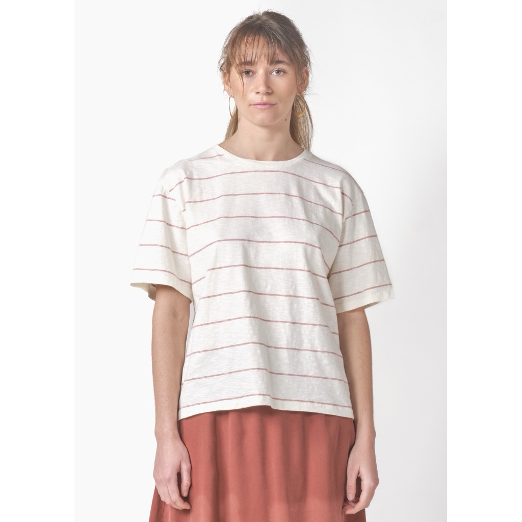 Lys tee i øko-bomuld med horisontale striber, der er vævet sammen med den creme bundfarve, så striben ikke bliver så massiv. Drop-skuldre, rund hals-udskæring og en løs pasform.