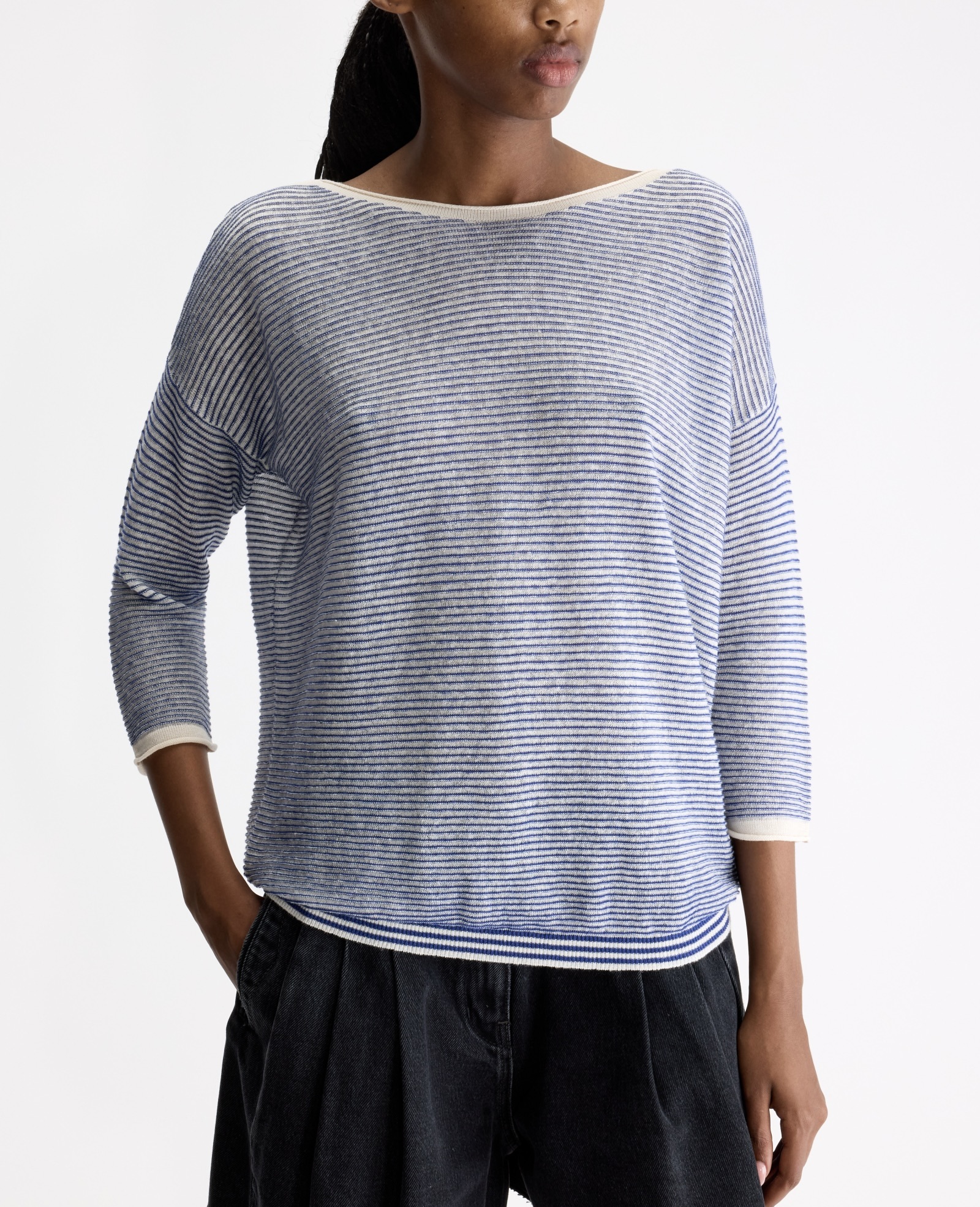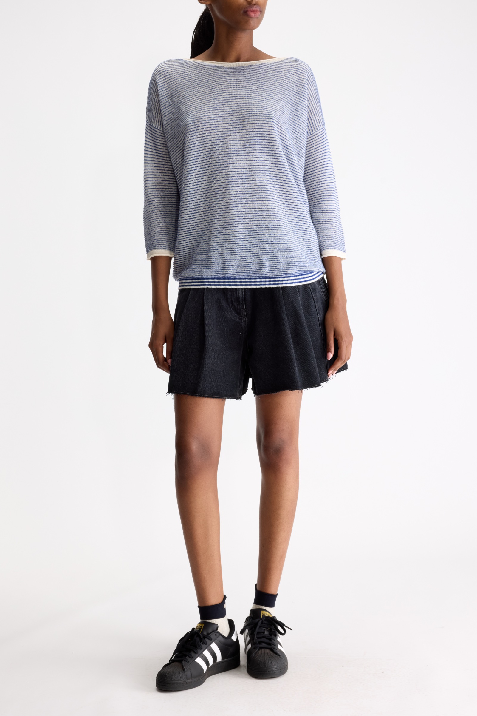 En let sommerstrik i hvide og blå fine striber med en bredere strib som ribafslutning nederst. Bådudskæring, dropskuldre og tætte trekvartlange ærmer, der afsluttes med en rullekant. Lidt stor i størrelsen.