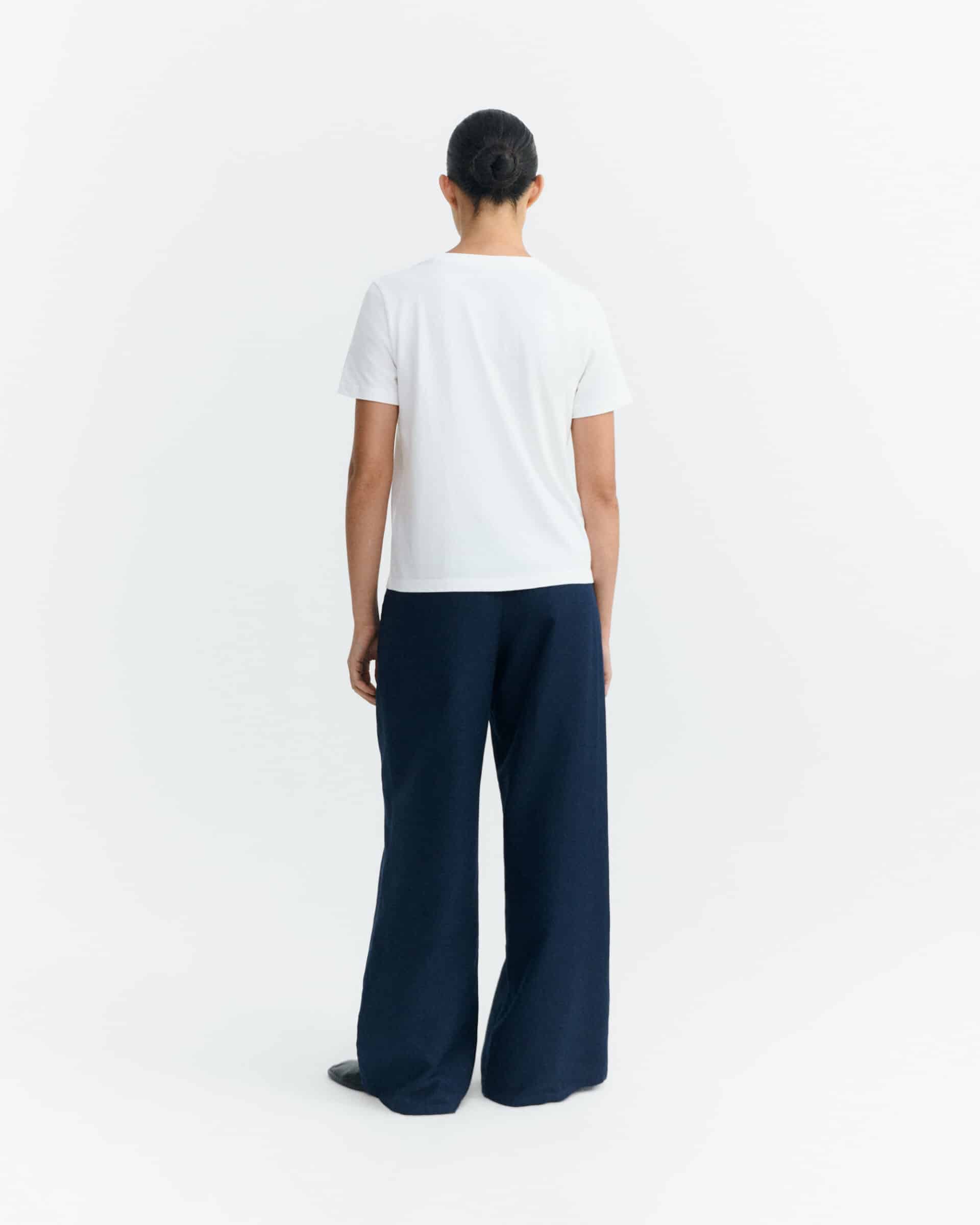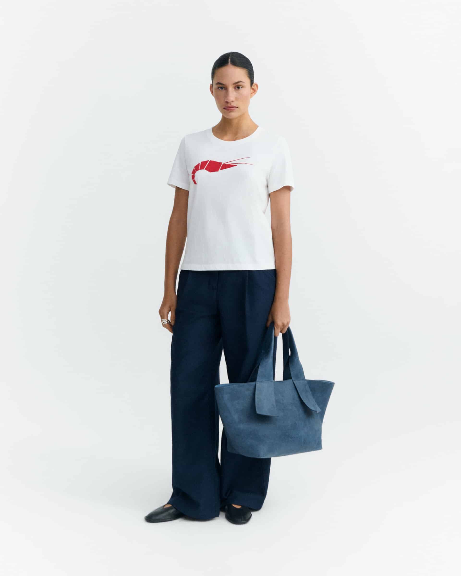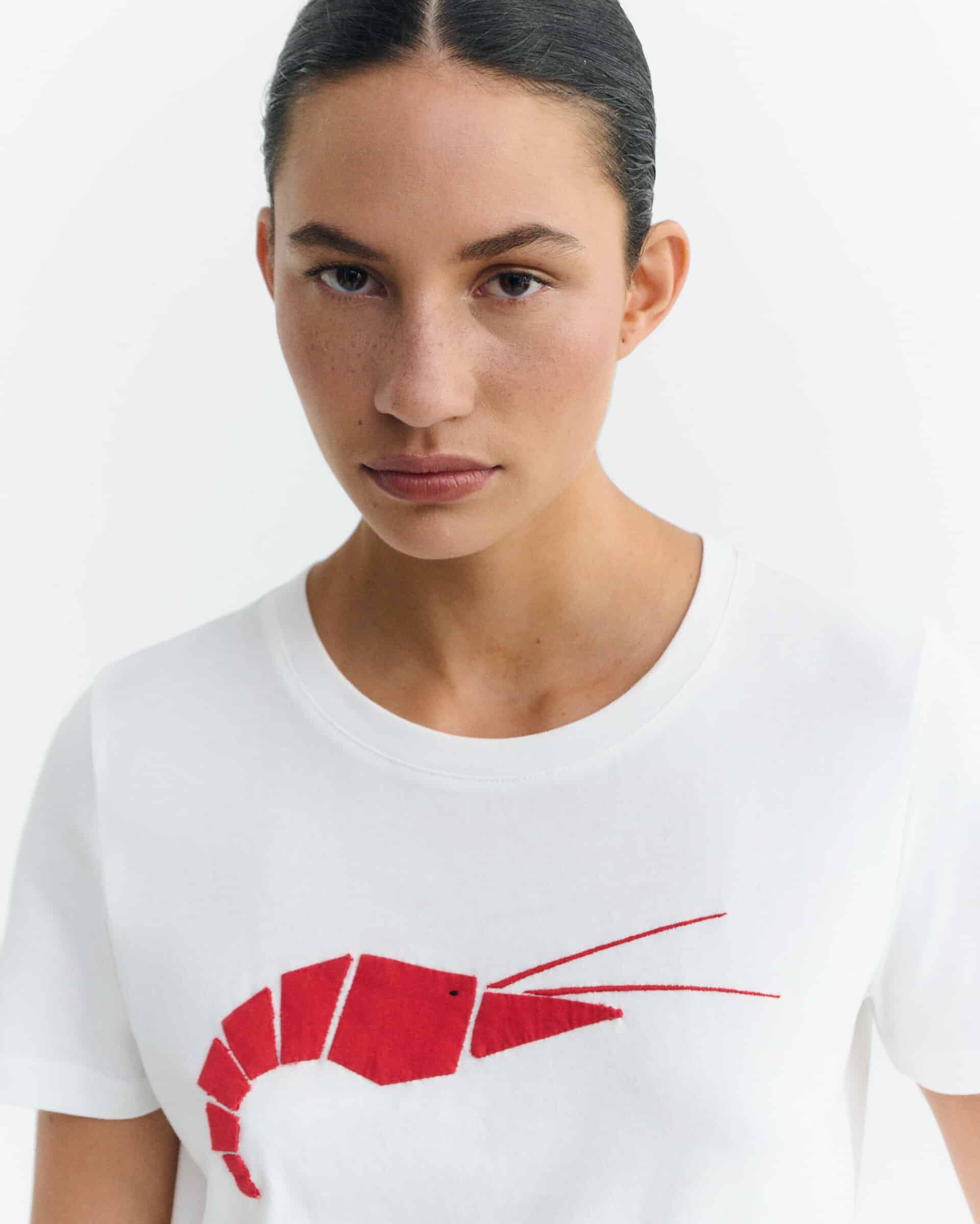 Hvid t-shirt i økologisk bomuld med rund hals og korte ærmer. Foran er et rødt reje-motiv sammensat af små stofstykker, der giver et grafisk, næsten håndklippet udtryk. Lige pasform og en ren, enkel silhuet.