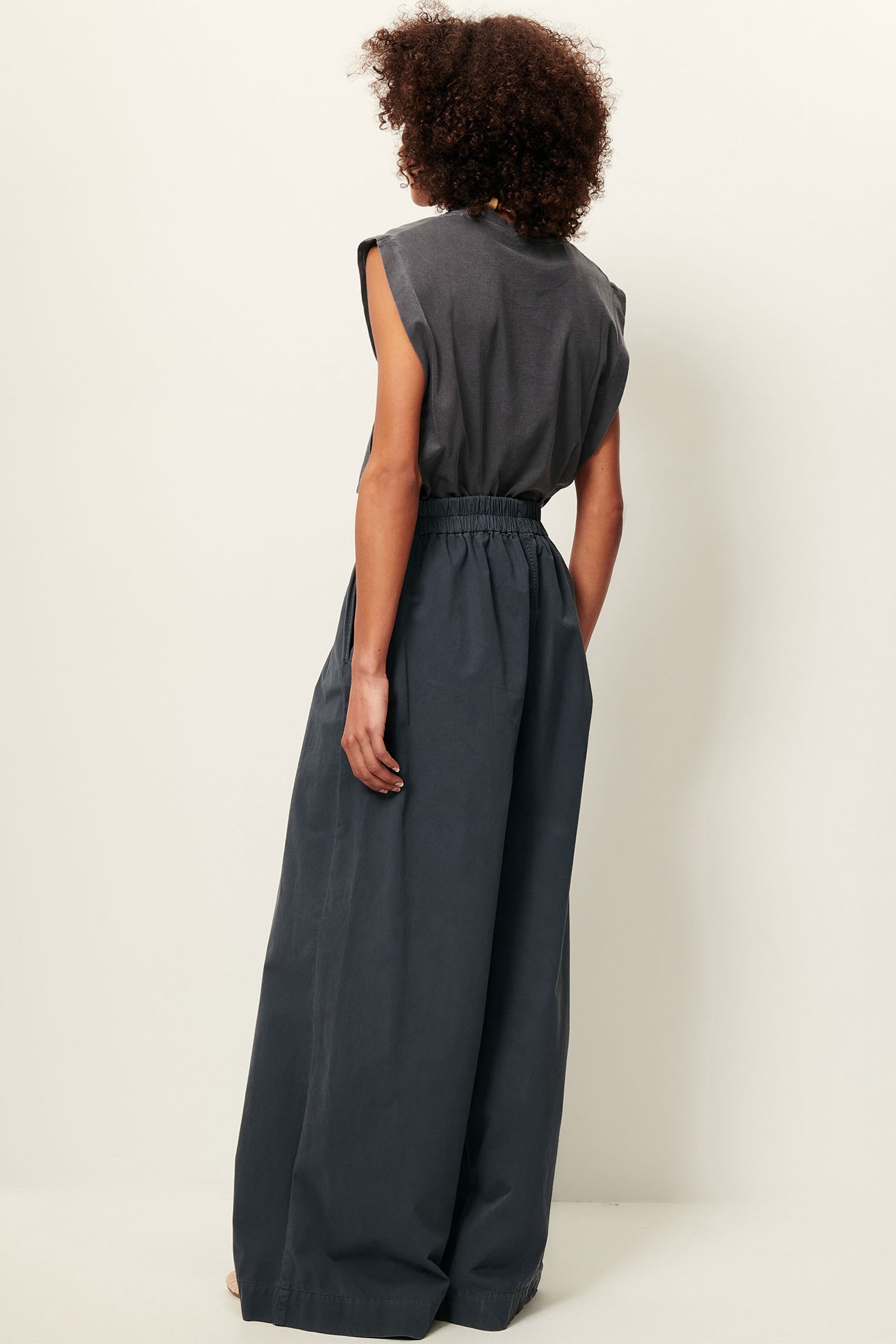 Stine prøver her en small i den ternede heldragt i øko vævet bomuld