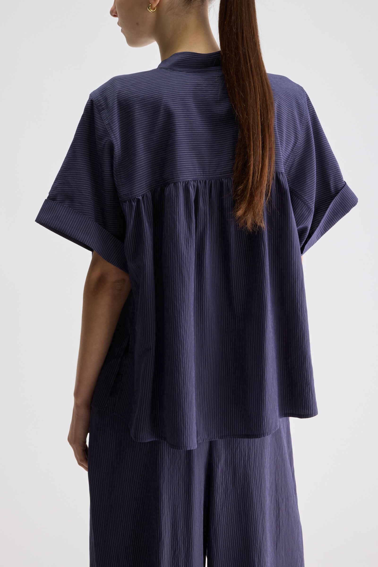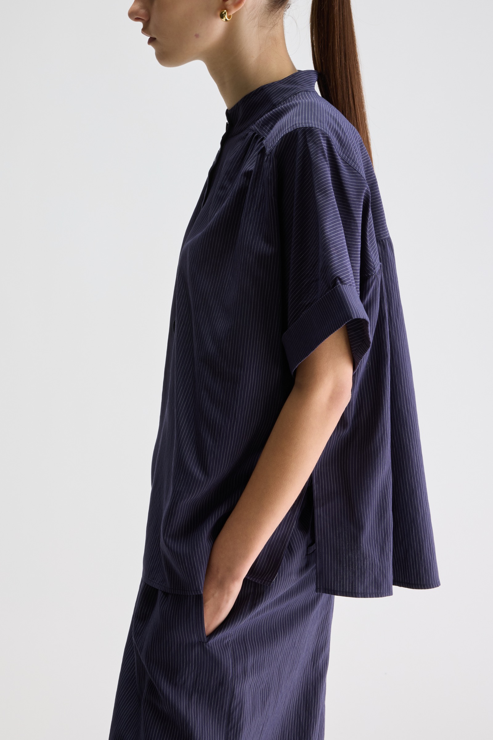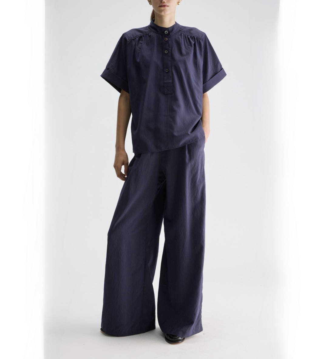 En bestseller gennem tre sæsoner, nu i navy med fine lyse nålestriber. En lige pasform med lille opretstående krave og rynkede detaljer, der giver let volumen. Ærmerne er afsluttet med ombuk, og nederst en lige kant med slidser i siderne. Stor i størrelsen, så gå evt en størrelse ned, for at få den en anelse kortere og mindre oversized. Kan styles som sæt med Vespa wide trousers.