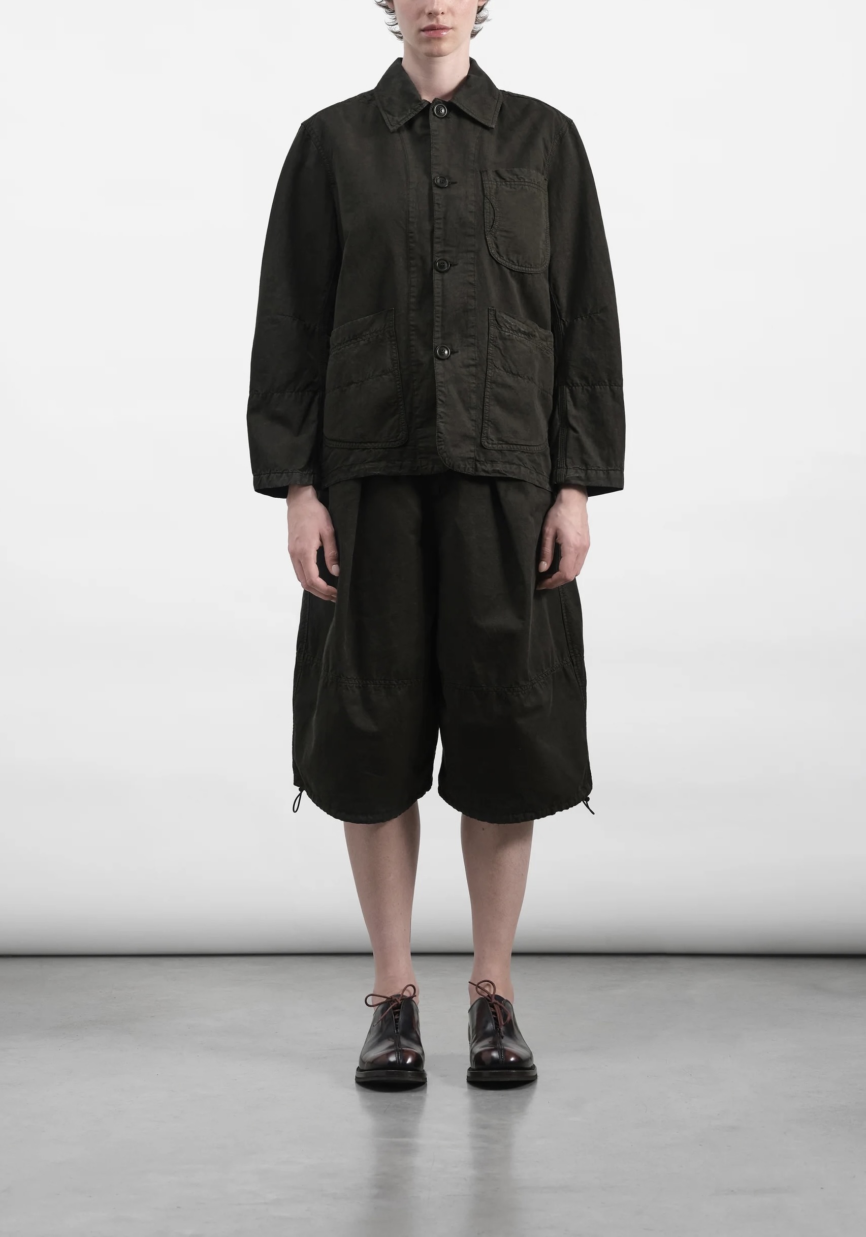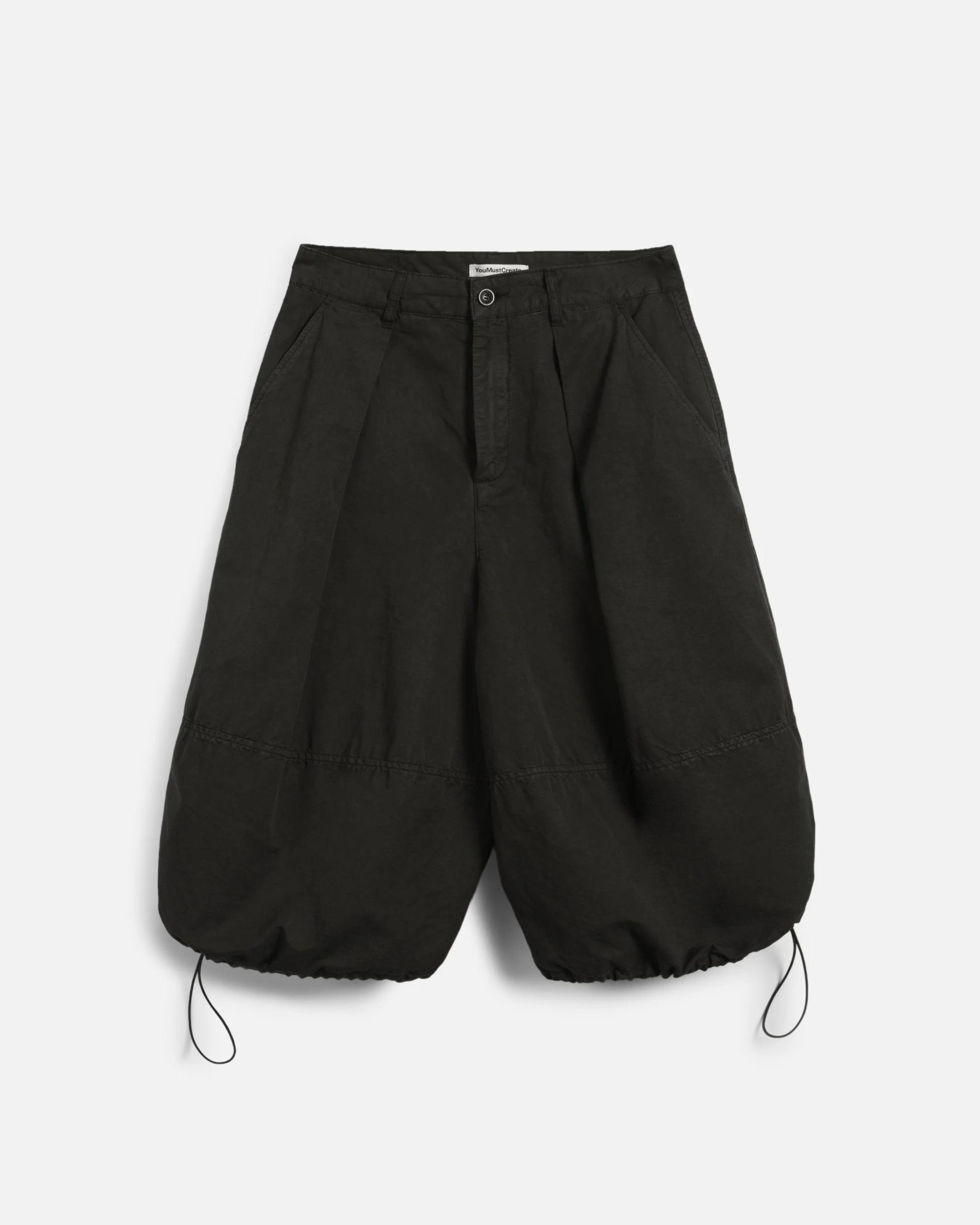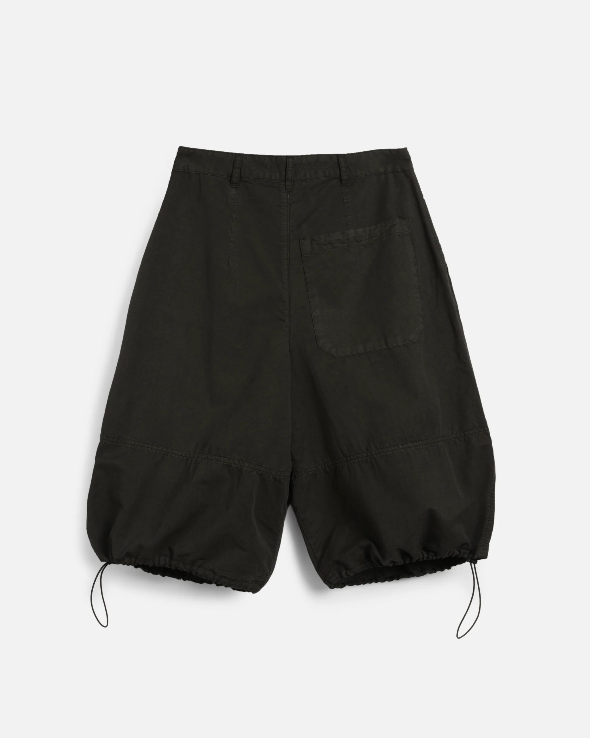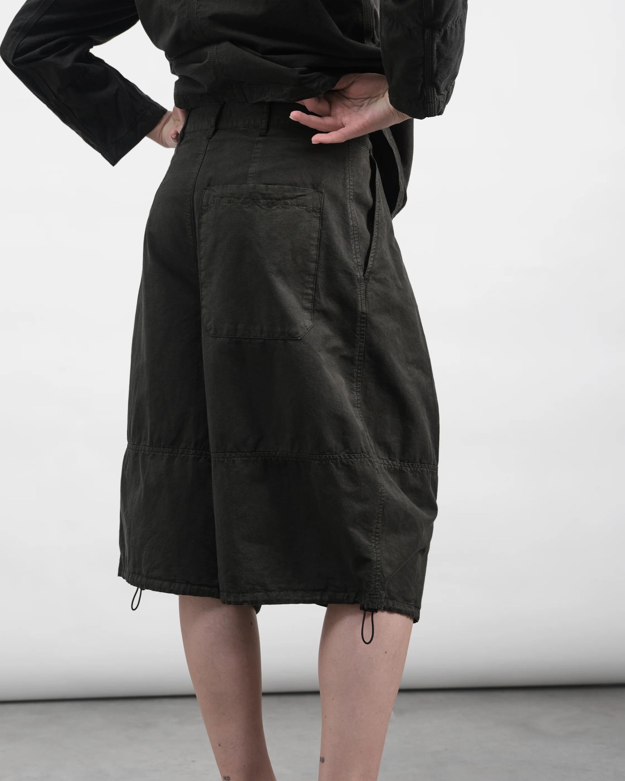 Mørkegrønne shorts i bomuld-hør, garment dyed for en blød, levende farve. Modellen har vidde og går til knæet med justerbare snører i kanten. Skrå sidelommer og en påsyet baglomme, linning med store læg, corozo-knap og lynlåsgylp.
