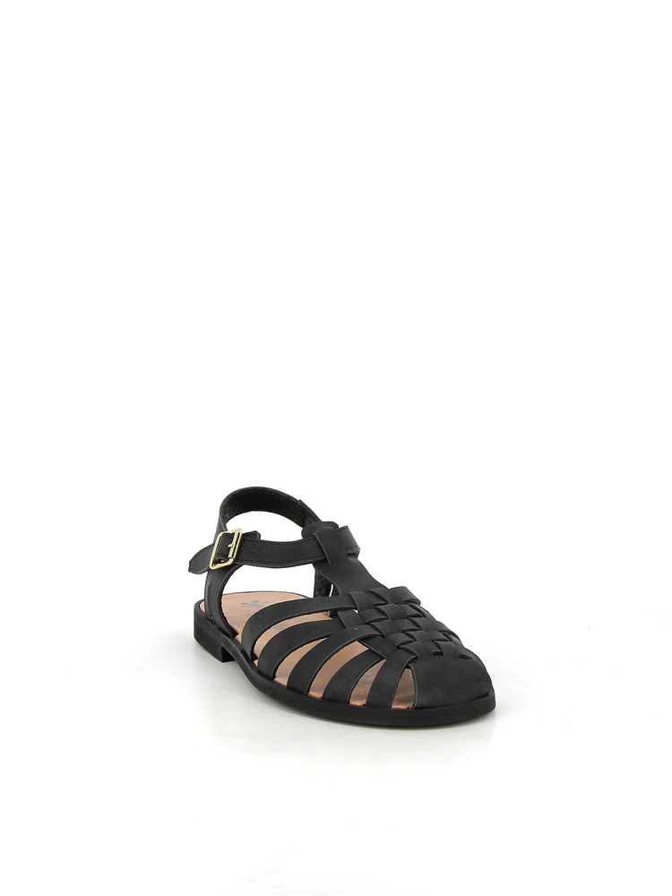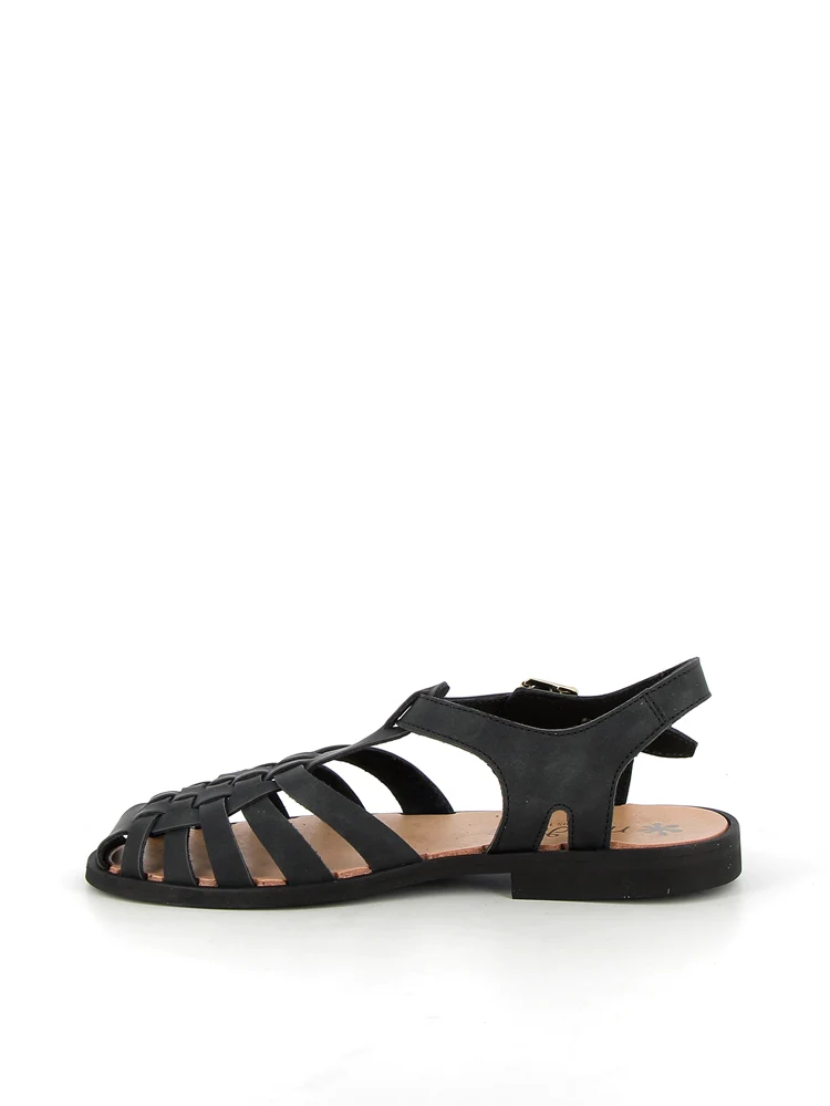 Flet-sandal i læder med lille hæl, afrundet snude og metalspænde i siden. Sandalen er størrelsessvarende til den lille side, så vælg den størrelse, du plejer at bruge, eller hvis du ligger mellem to størrelser, vælg en størrelse op.
