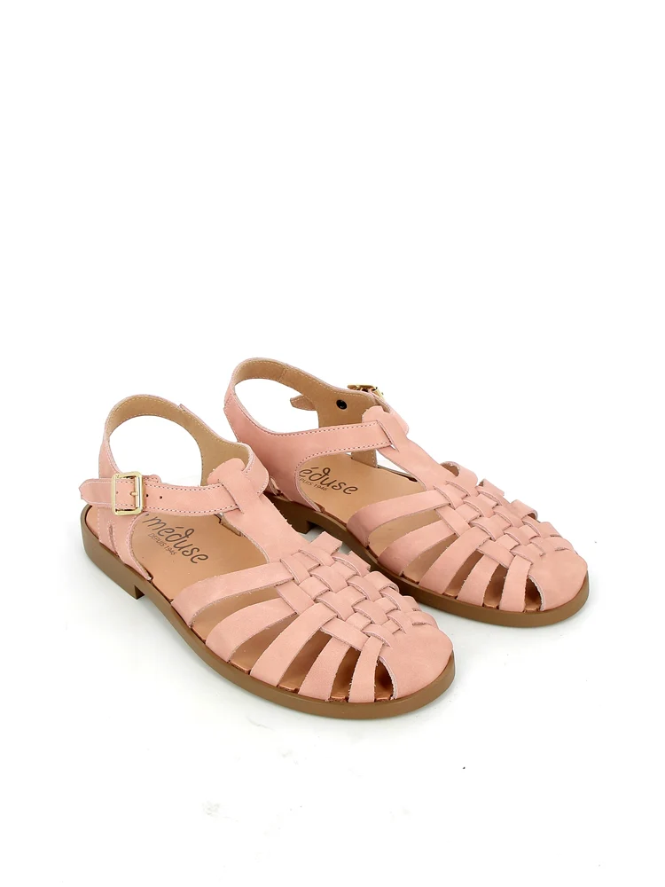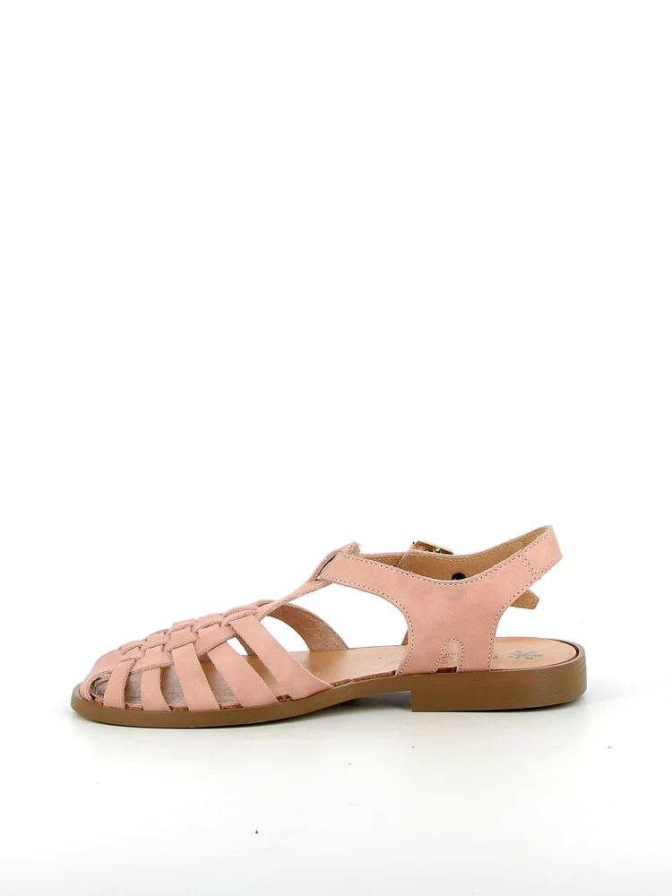 Flet-sandal i læder med lille hæl, afrundet snude og metalspænde i siden. Sandalen er størrelsessvarende til den lille side, så vælg den størrelse, du plejer at bruge, eller hvis du ligger mellem to størrelser, vælg en størrelse op.